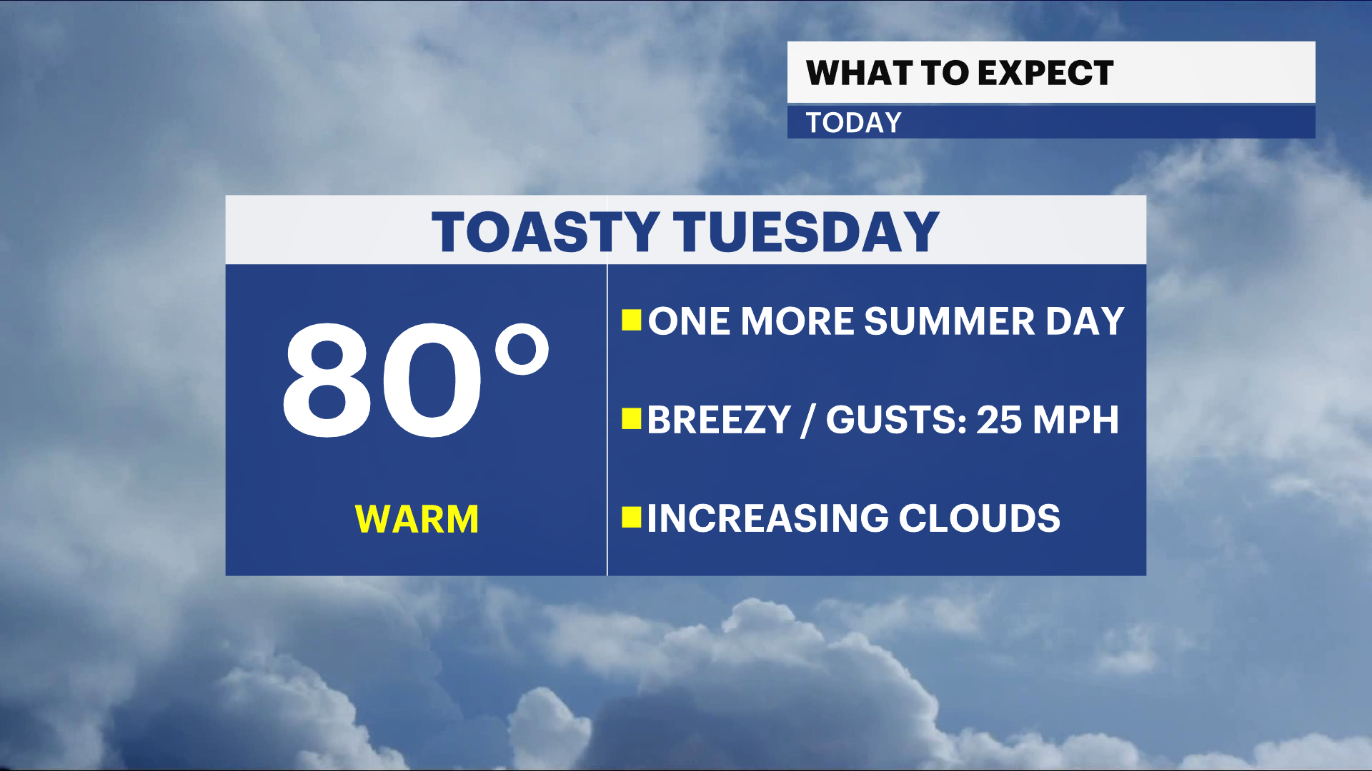 Today: Mostly sunny and still warm. Noticeably breezy. Highs near 80.