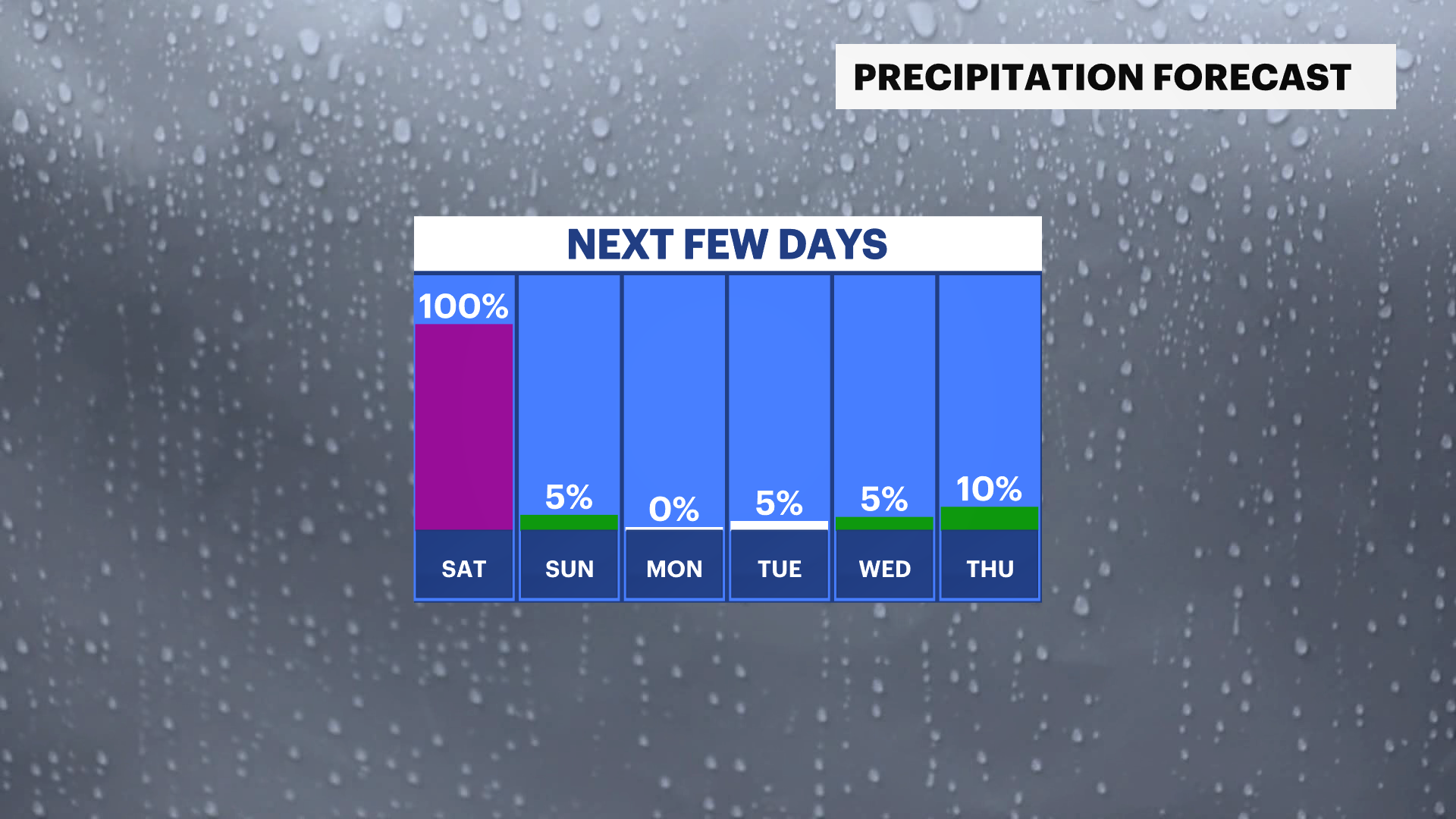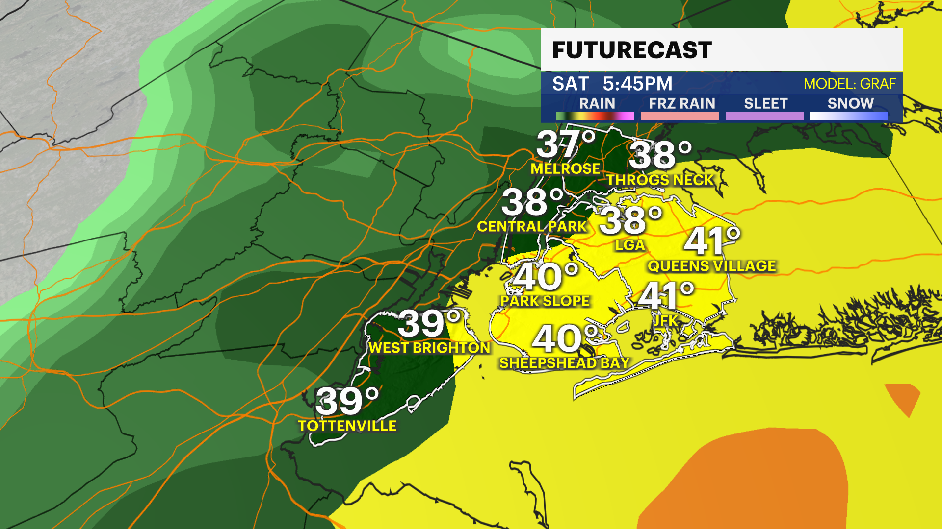 Overnight: Light rain early, cloudy and chilly. Lows near 45. Saturday: Cloudy start, steady rain and cool. Highs near 47. Lows near 41.