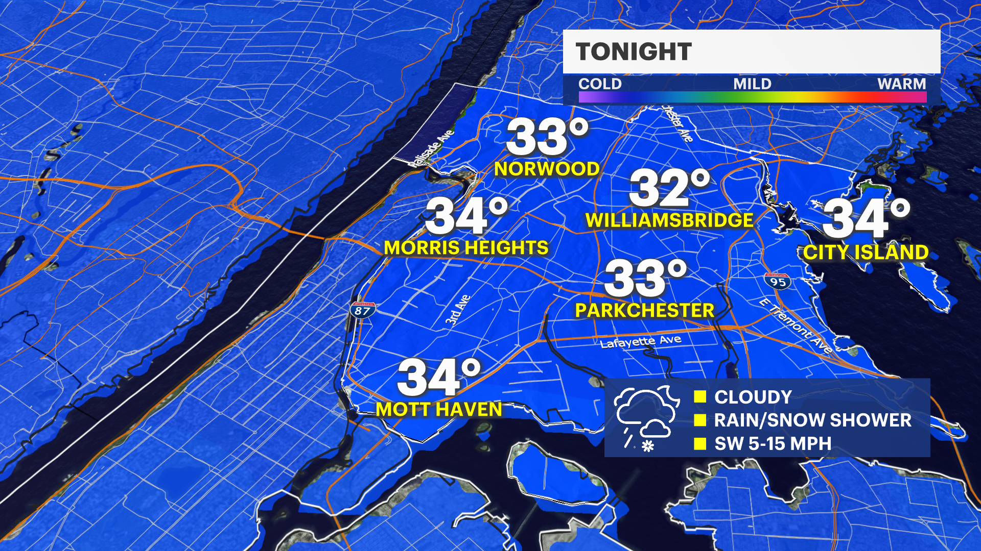 TONIGHT: Mostly Cloudy with a chance for a passing rain or snow shower, with a low 32 to 38. Southwest wind 5 to 15 mph.
