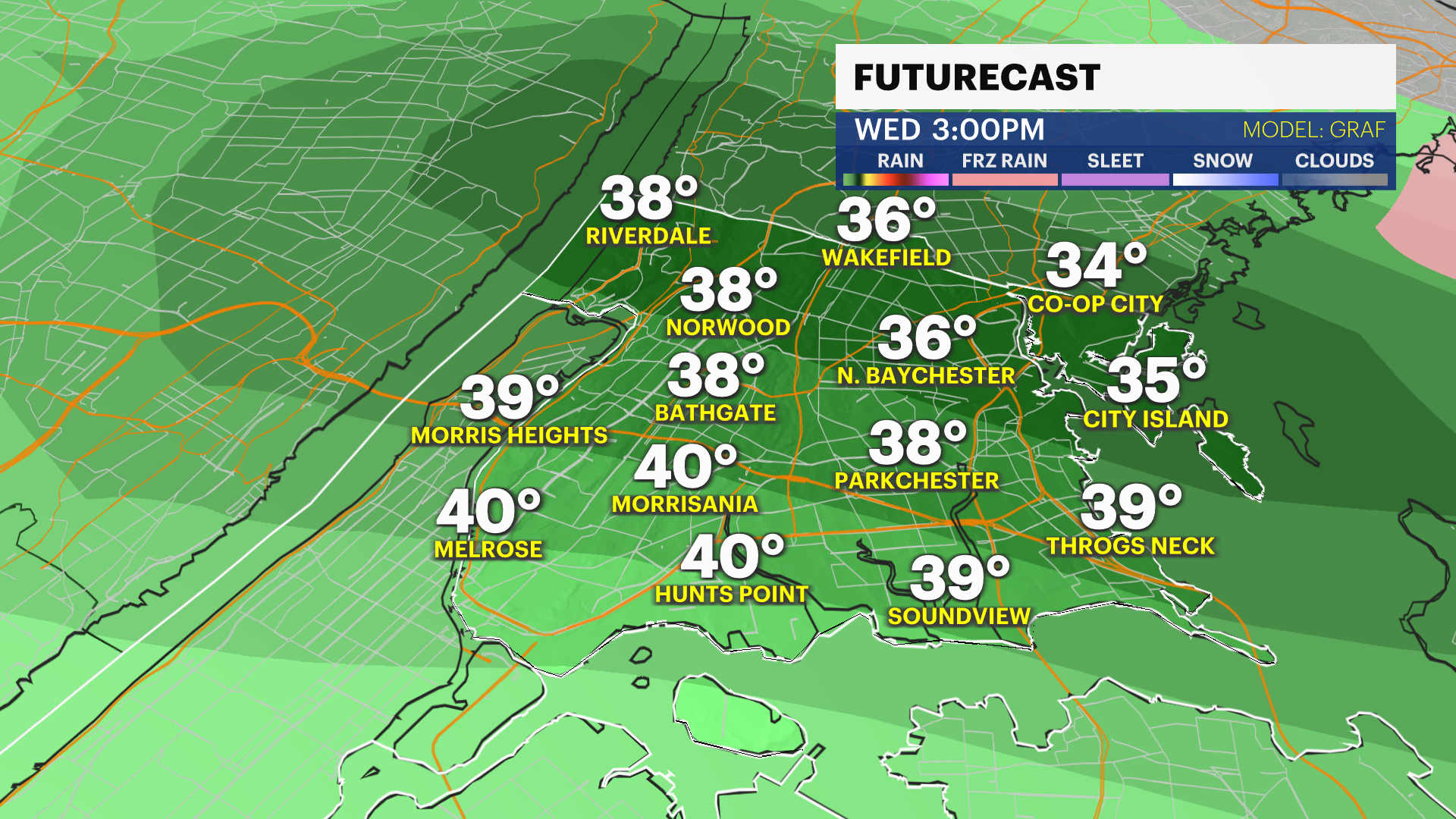 Wednesday Night: Rain likely before 1am. Mostly cloudy, with a low around 33.