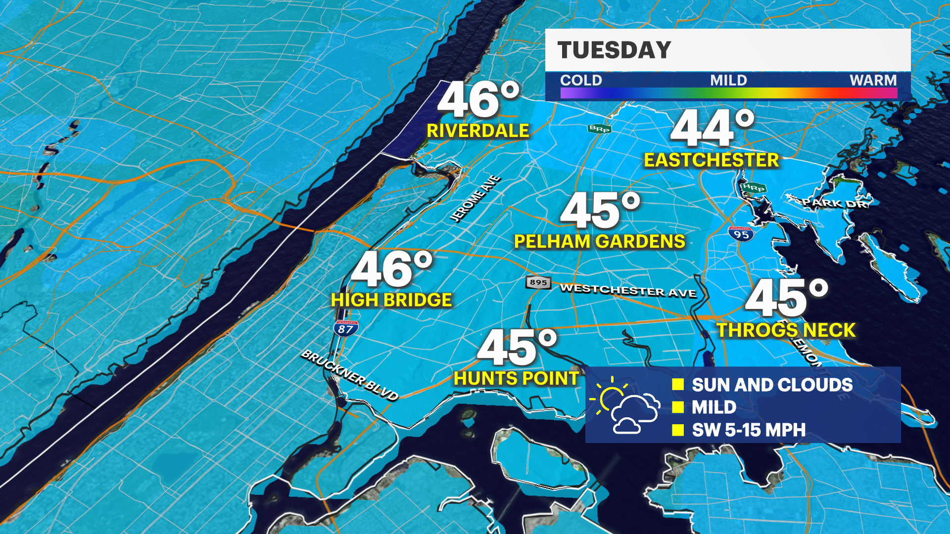 Tuesday: Warmer with more melting snow. Cloudy, then gradually becoming mostly sunny, with a high near 46. Calm wind becoming southwest 5 to 15 mph.