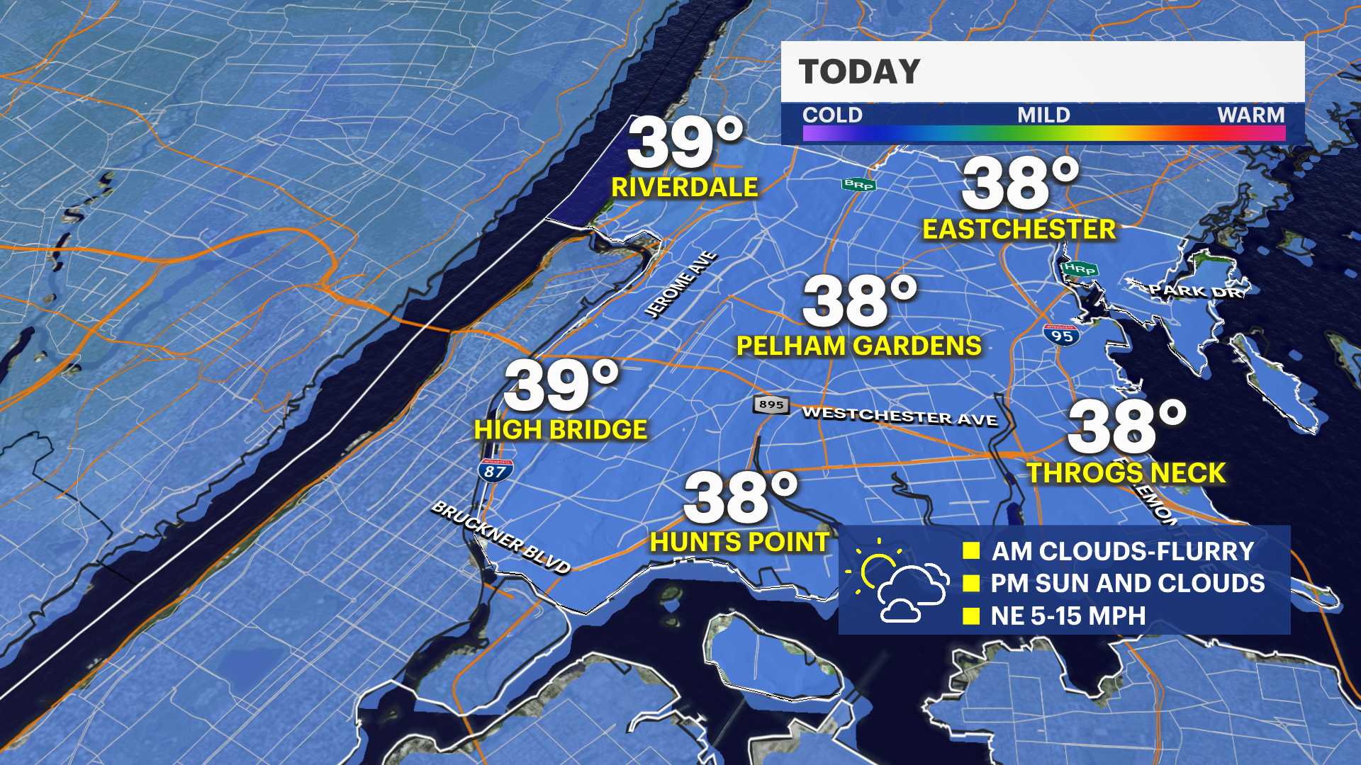 TODAY: Clouds will give way to sun and clouds. Highs near 39. Wind chill values between 20 and 30. Northeast wind 5 to 15 mph.