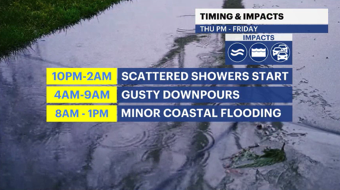 The Friday morning commute to work and school is going to be a miserable one. Wind-driven rain will cover streets with huge puddles. Gusty winds could have the power flickering from time to time during the day tomorrow as well.