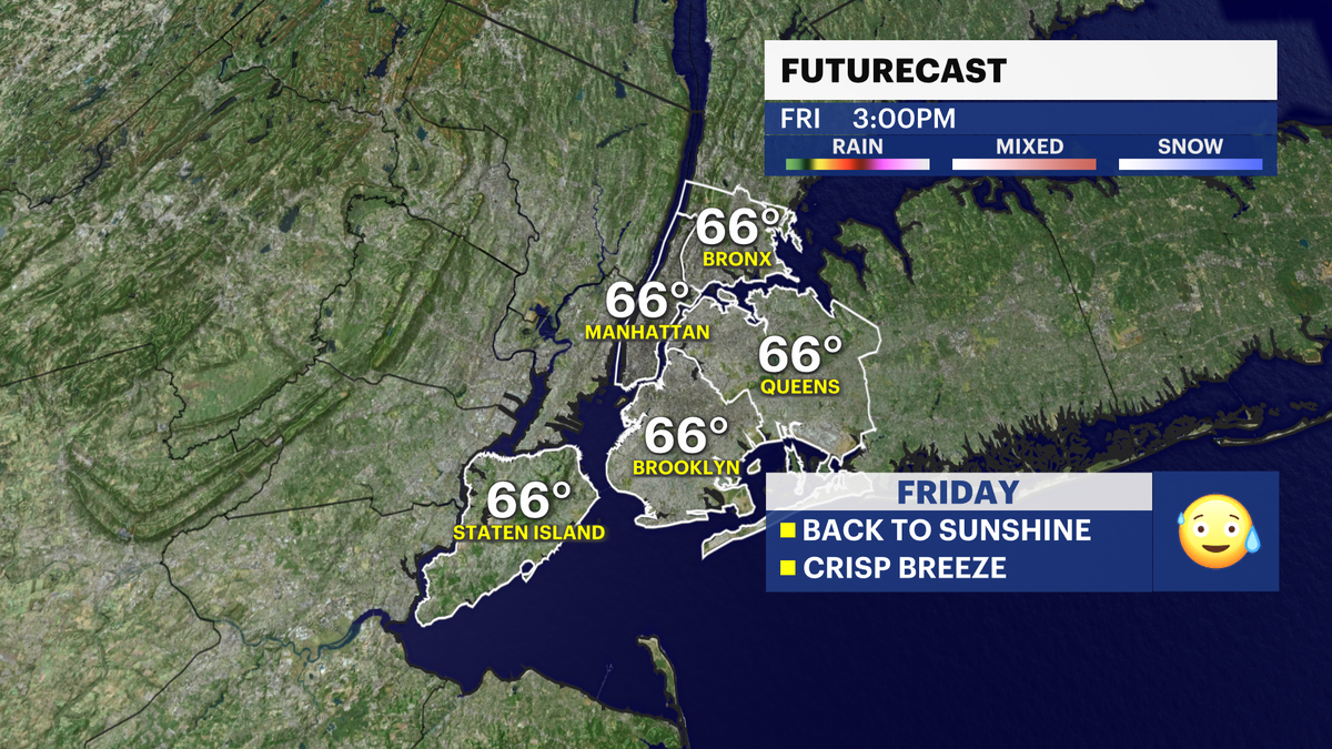FRIDAY: Sunny and breezy. Highs near 69. Lows near 53.