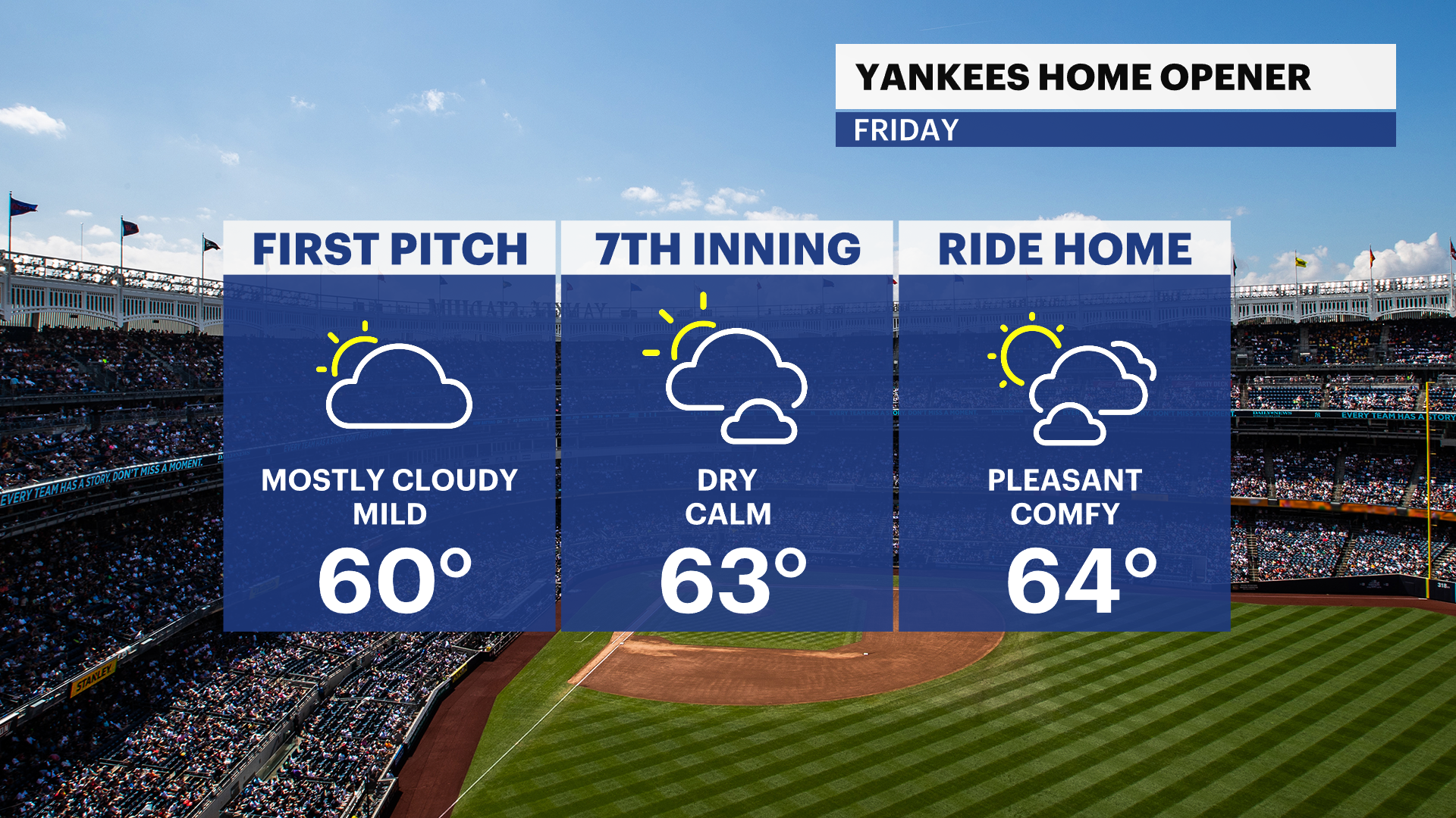 Temperatures start to rebound Friday into the mid‑60s, which will be perfect for the Yankees' home opener! By Saturday, we’re back in the low 70s with a mix of sun and clouds.