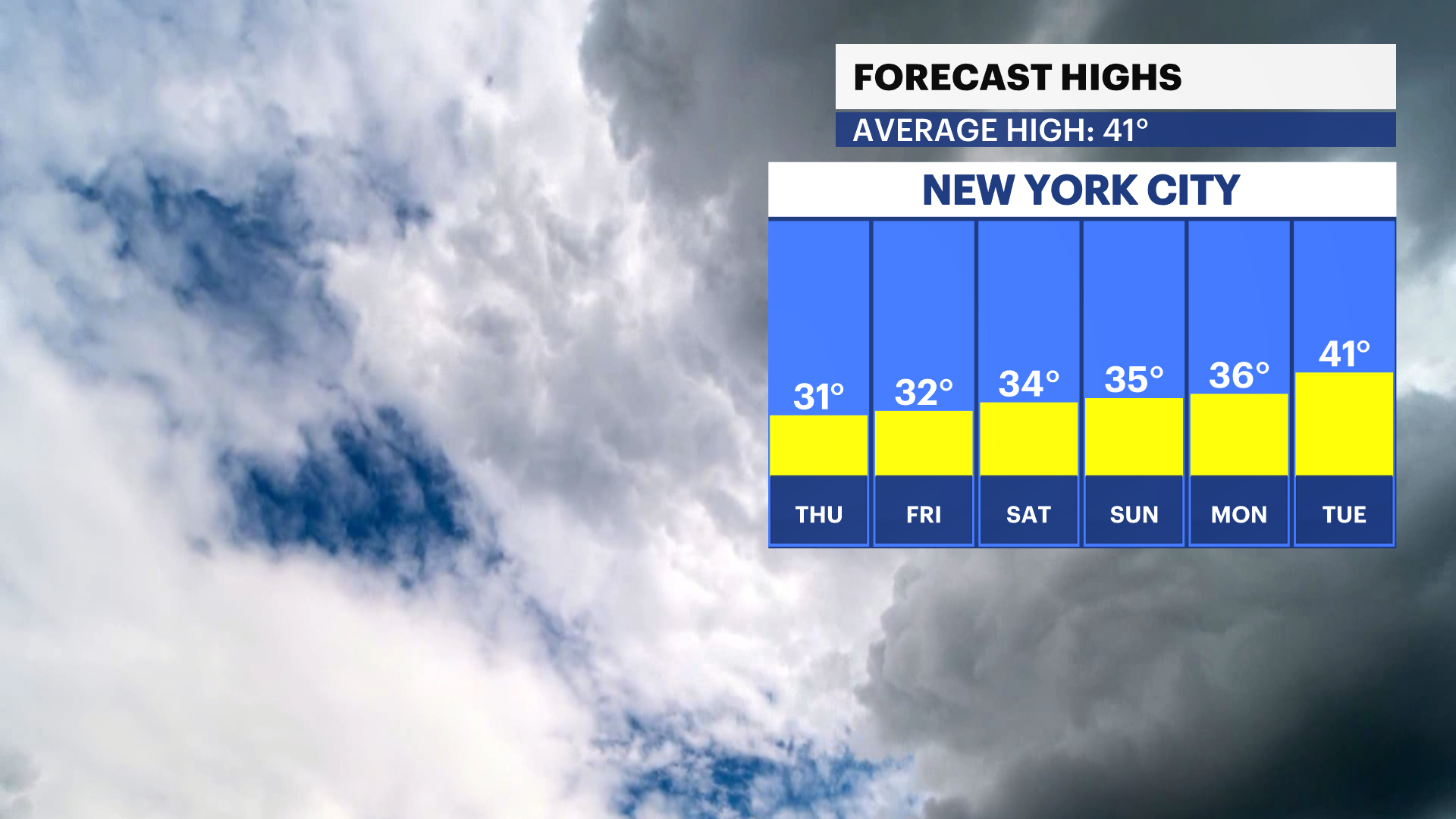 Tuesday: Cloudy but milder, highs reaching the upper-30s to low-40s.