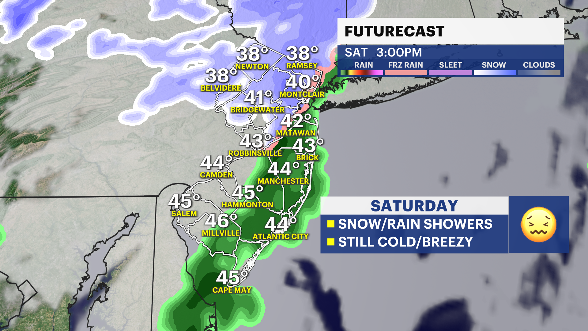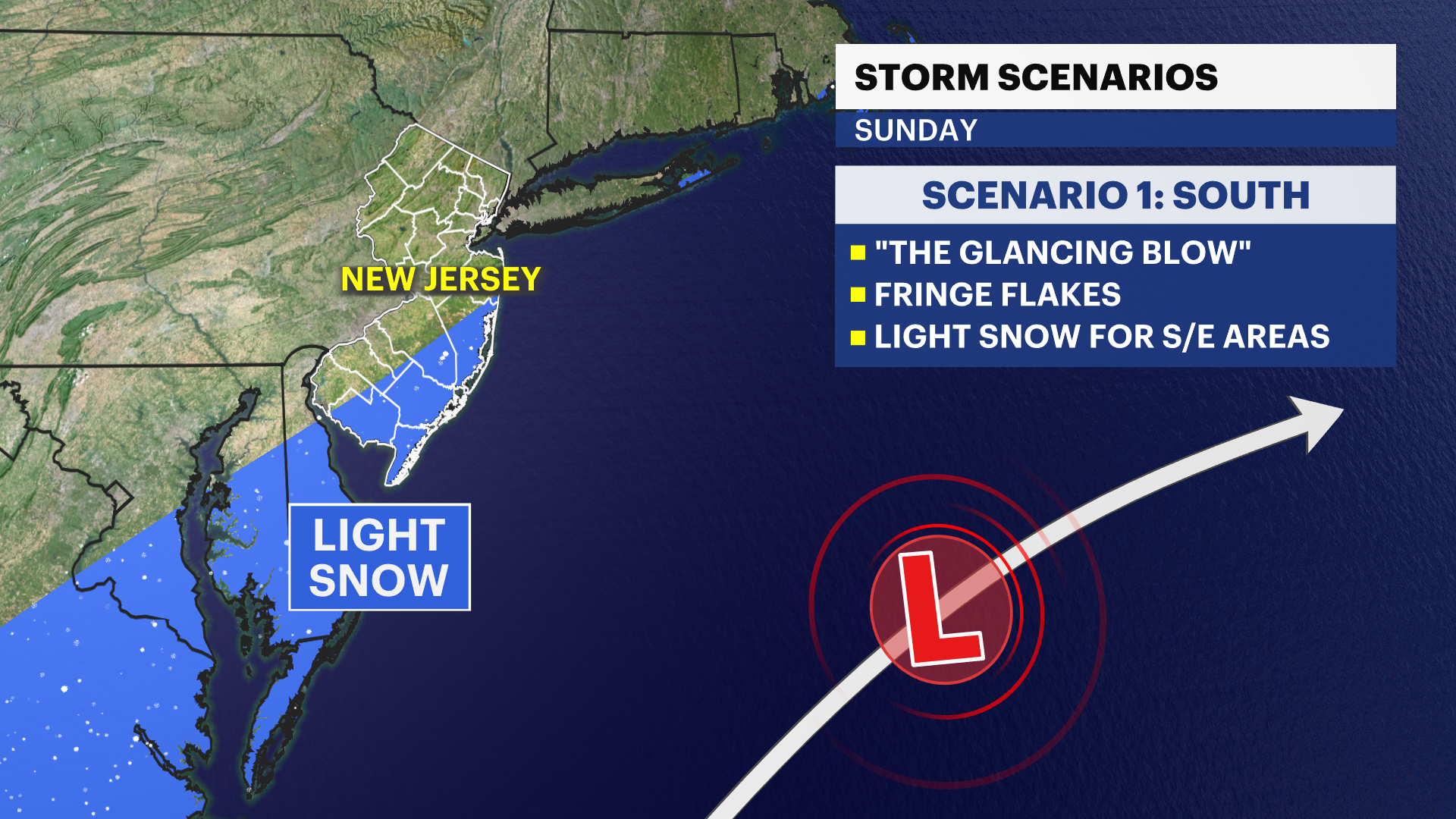 Sunday's situation is complex. A coastal storm is expected to emerge across the Carolina coast with the subtropic jet stream. This storm is currently more likely to take a southern track, which provides coastal and southern NJ with a glancing blow of light snow.