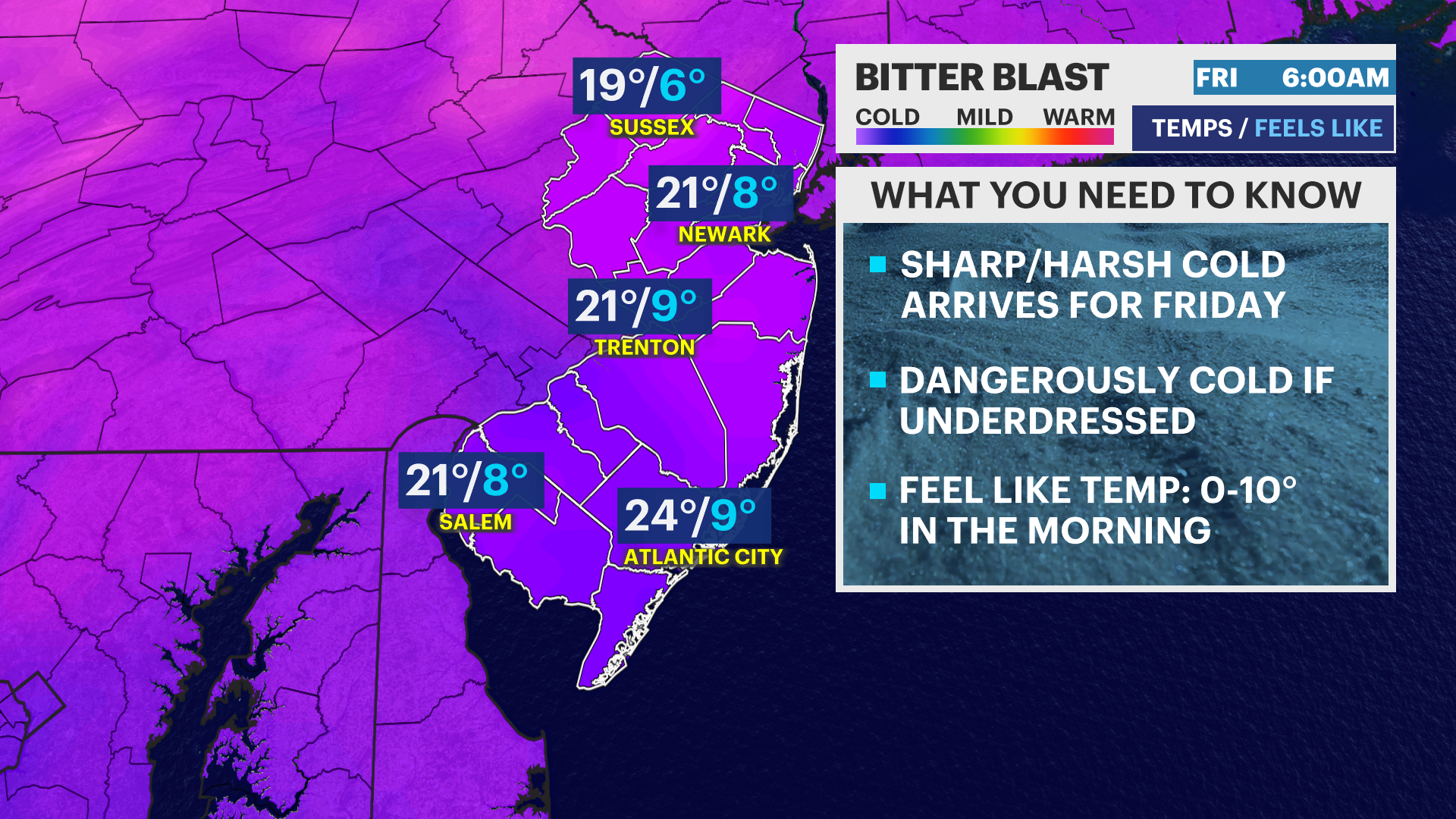 Friday morning will be frigid with low temperatures near 19 and feels like temperatures between 0 and 10 degrees. This cold weather will remain throughout the day with highs struggling to reach the freezing mark by the afternoon. This cold is dangerous if underdressed.