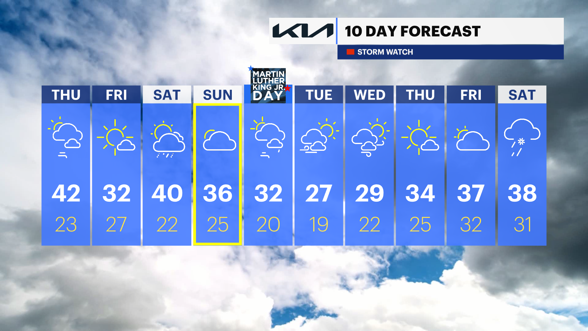 Saturday: Mostly sunny and cold. Highs near 37. Lows near 28.