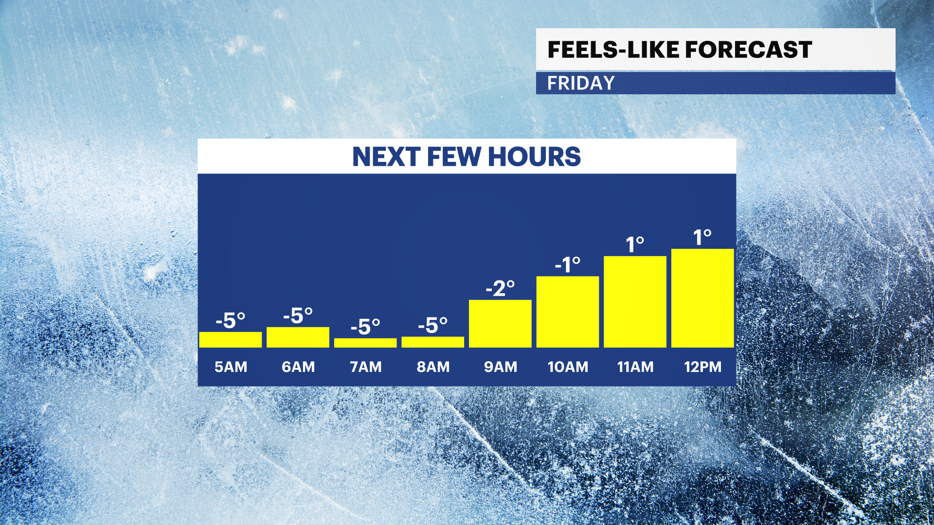 Friday will bring the seventh day of below-freezing temperatures. The core of the cold will last through this weekend with severely cold wind chills below zero during the morning hours. This will be the longest stretch of sub-freezing temperatures since 2018, which lasted 9 days. The record is 16 days, set back in 1961. Temperatures will climb to the 30s through next week.