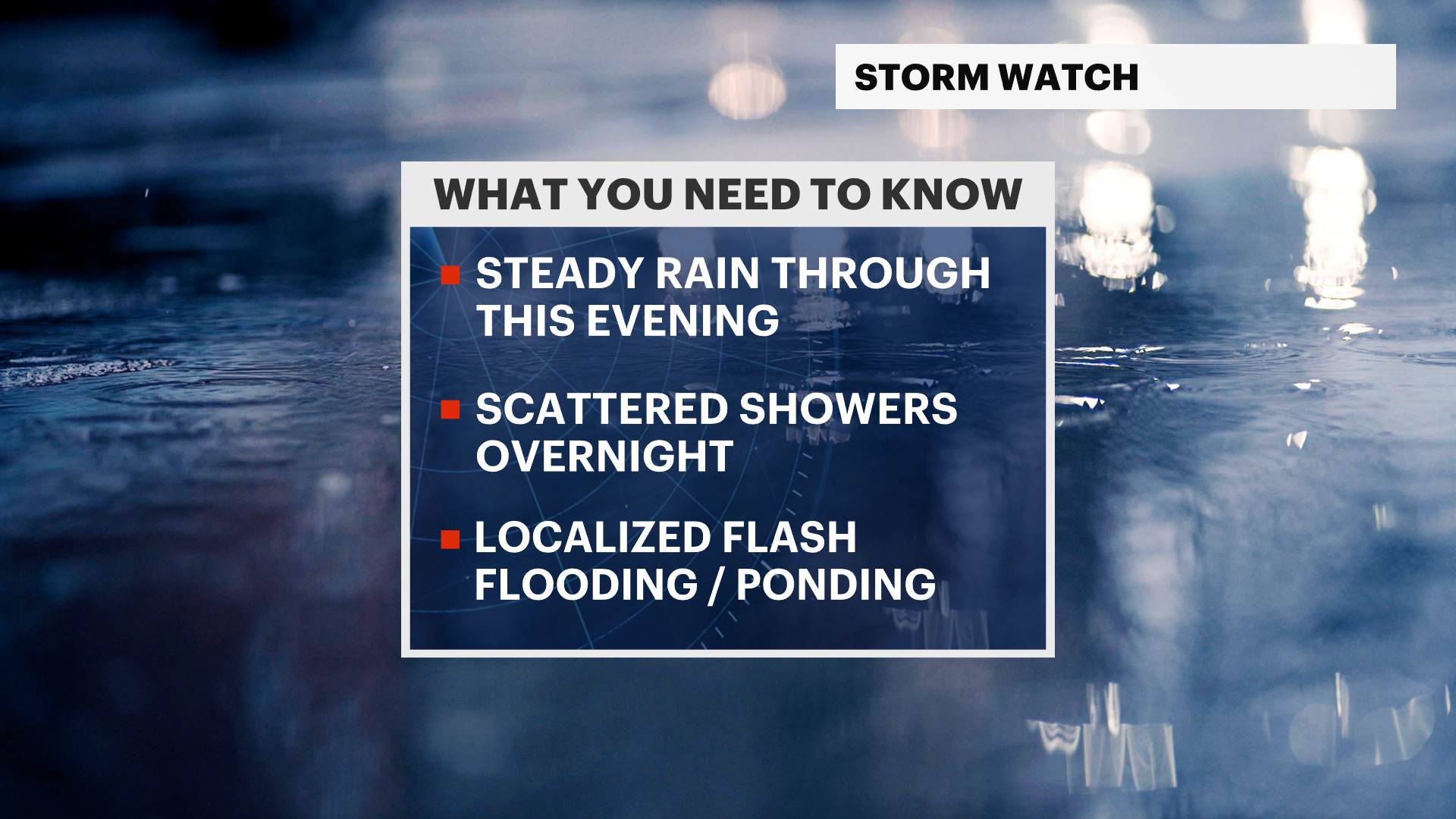 Storm Watch Team Meteorologist Darryl Green says rain will subside early tomorrow morning. Sunshine returns Thursday into the weekend with temps in the 80s.