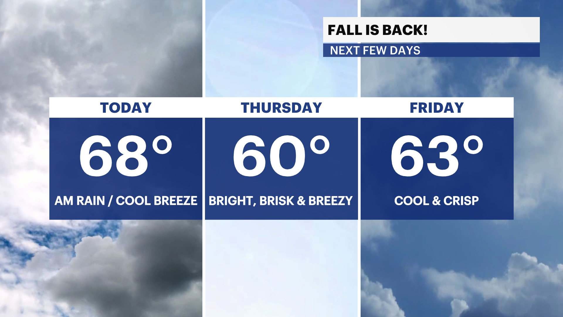 • Today will be much cooler, breezy with improving sky conditions. Highs will be in the mid to upper 60s.
