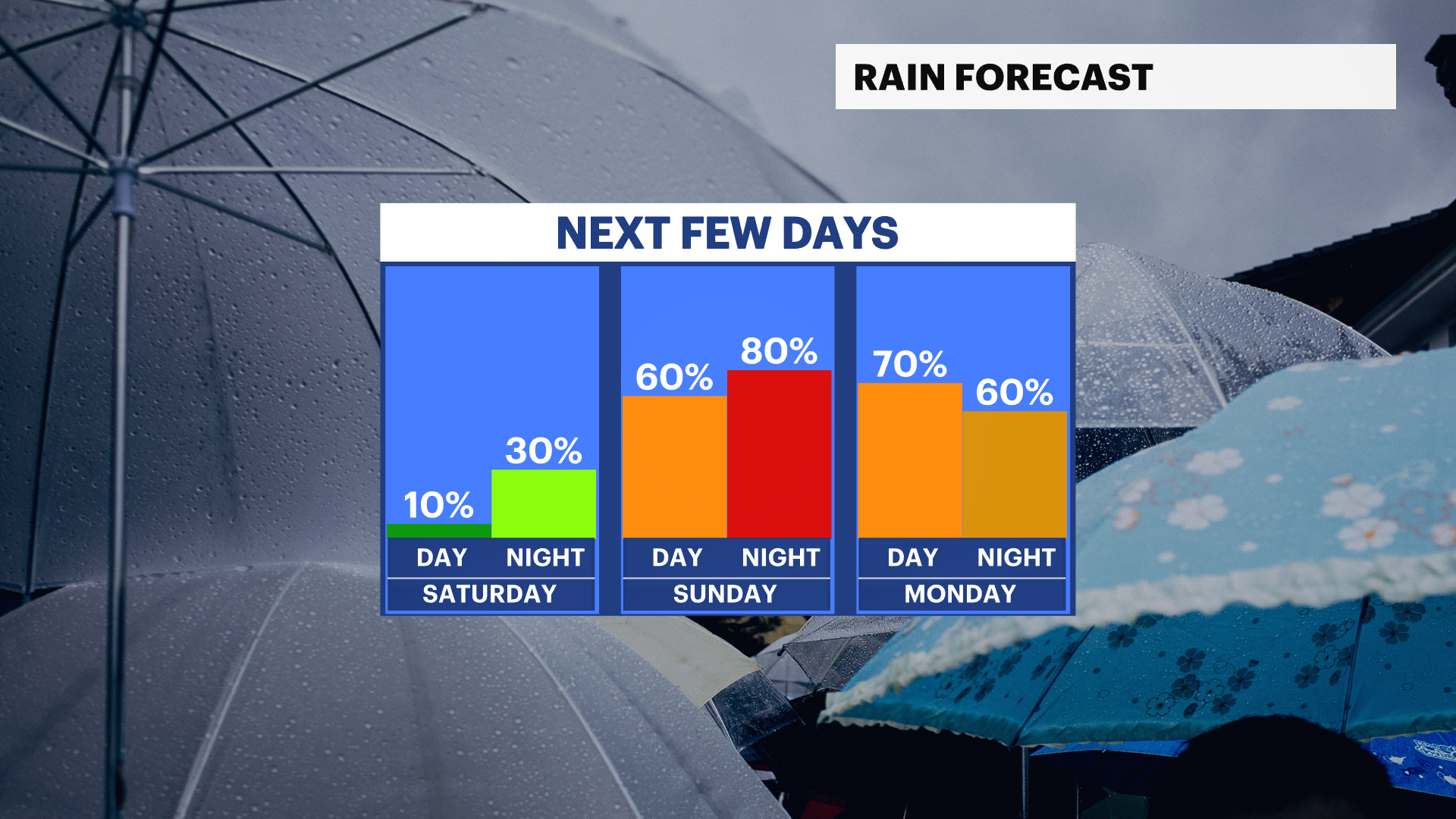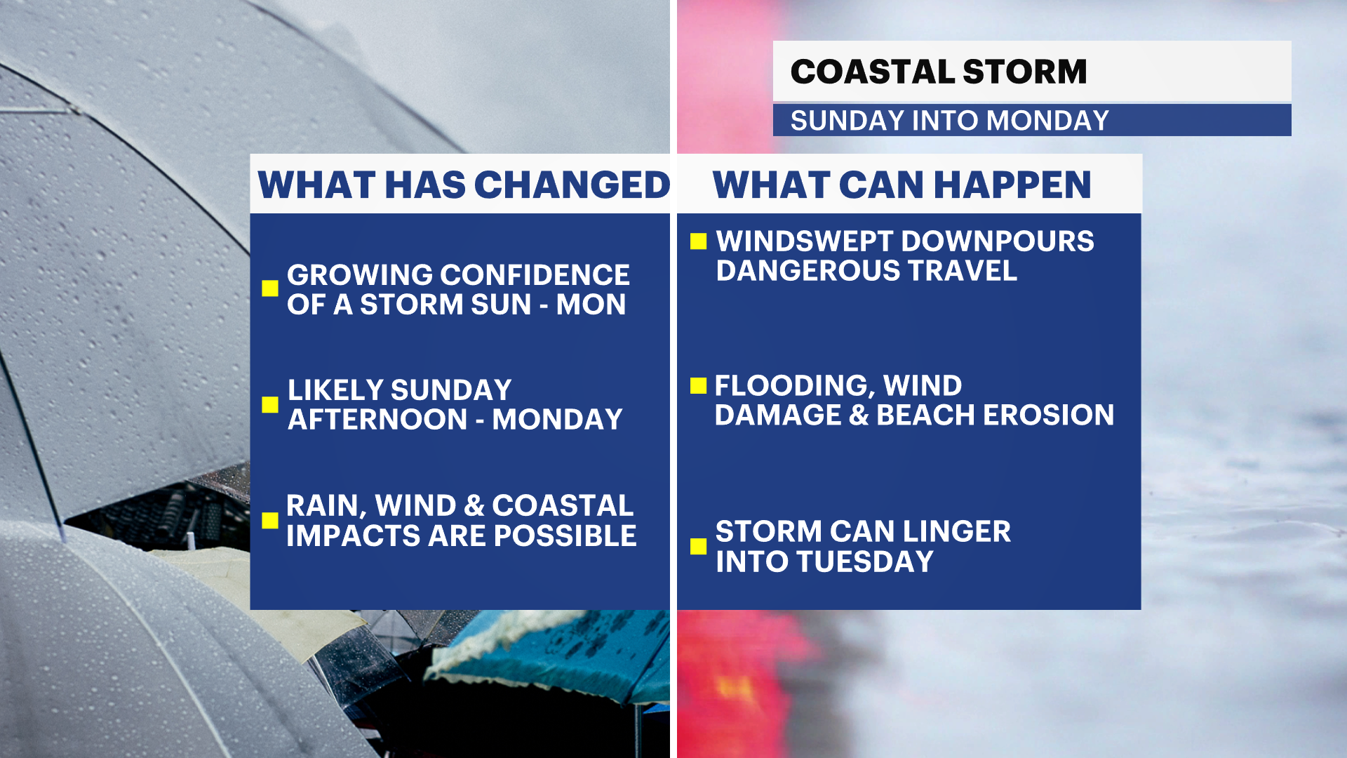 • We're watching for a potential coastal storm Sunday into Monday. Windswept rain can bring messy travel and coastal impacts. We're still a couple days out and a lot can still change with the trajectory and intensity with this system. However, there's a growing confidence that a storm will impact our area on Sunday into Monday. The intensity of the storm is still to be determined. If it continues its northern path, expect periods of heavy rain, flash flooding concerns, wind damage and coastal impacts. Stay tuned for updates!