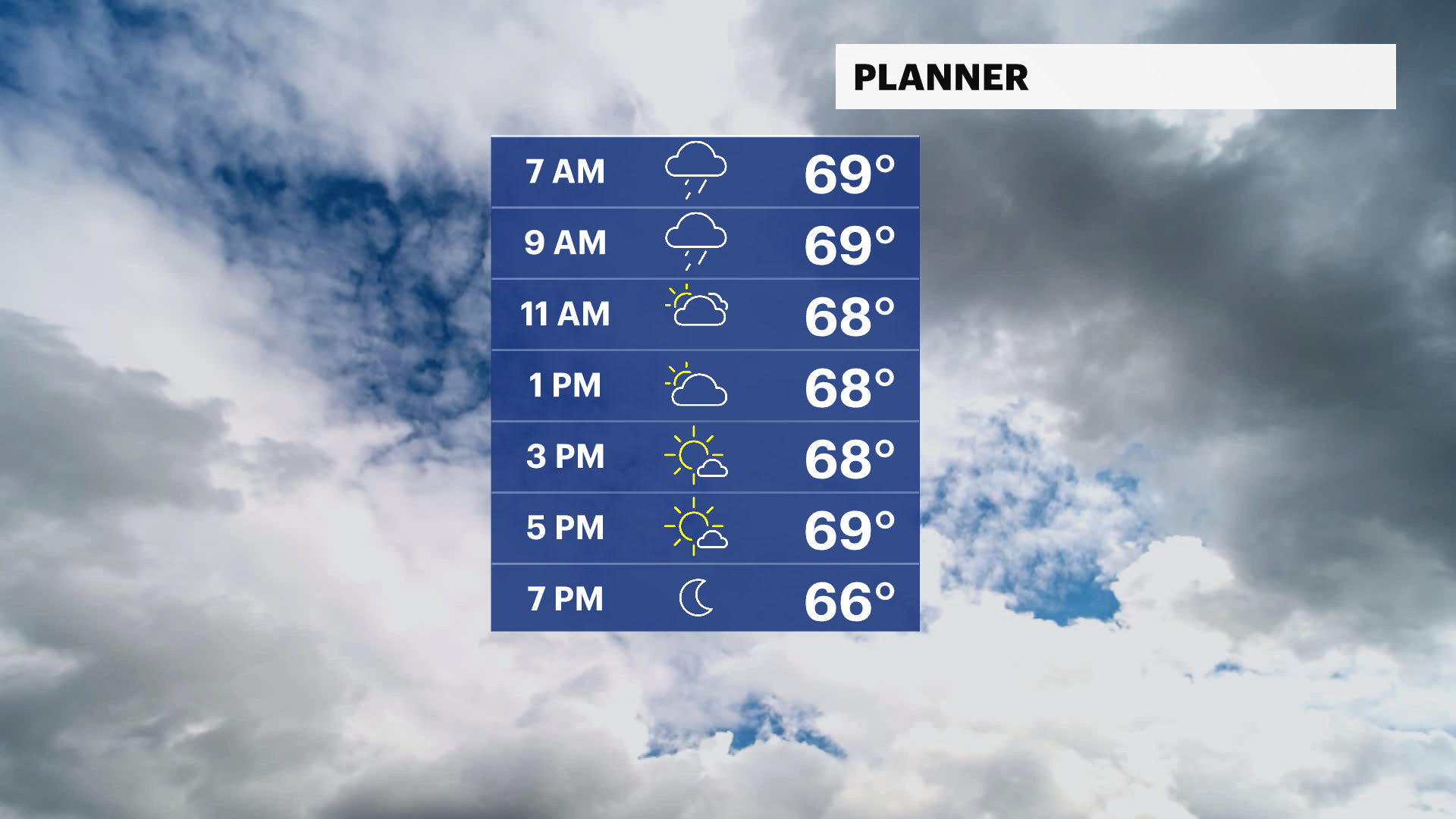 • It's a cloudy, wet and breezy start to the day. Temperatures are in the mid to upper 60s. Pockets of moderate to heavy rain will reduce visibility, bring slick travel and ponding on the roads.