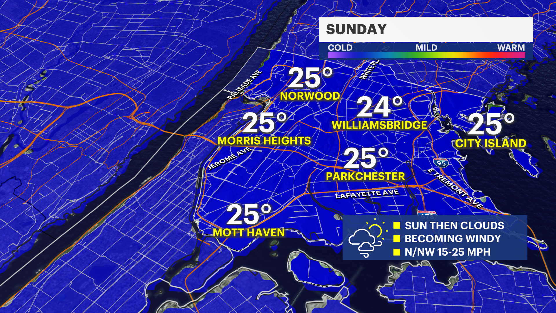 Wednesday: Mostly sunny and cold, with highs in the upper 20s to near 30.