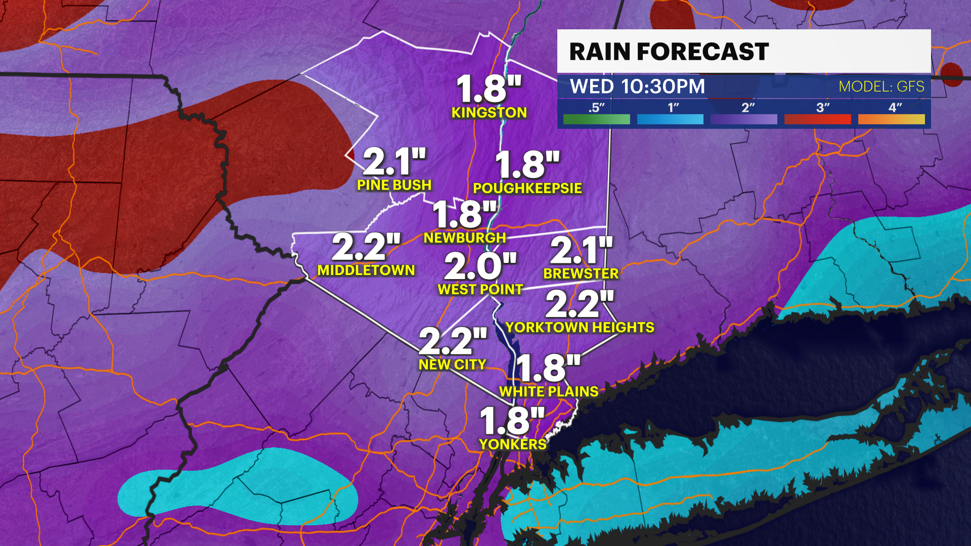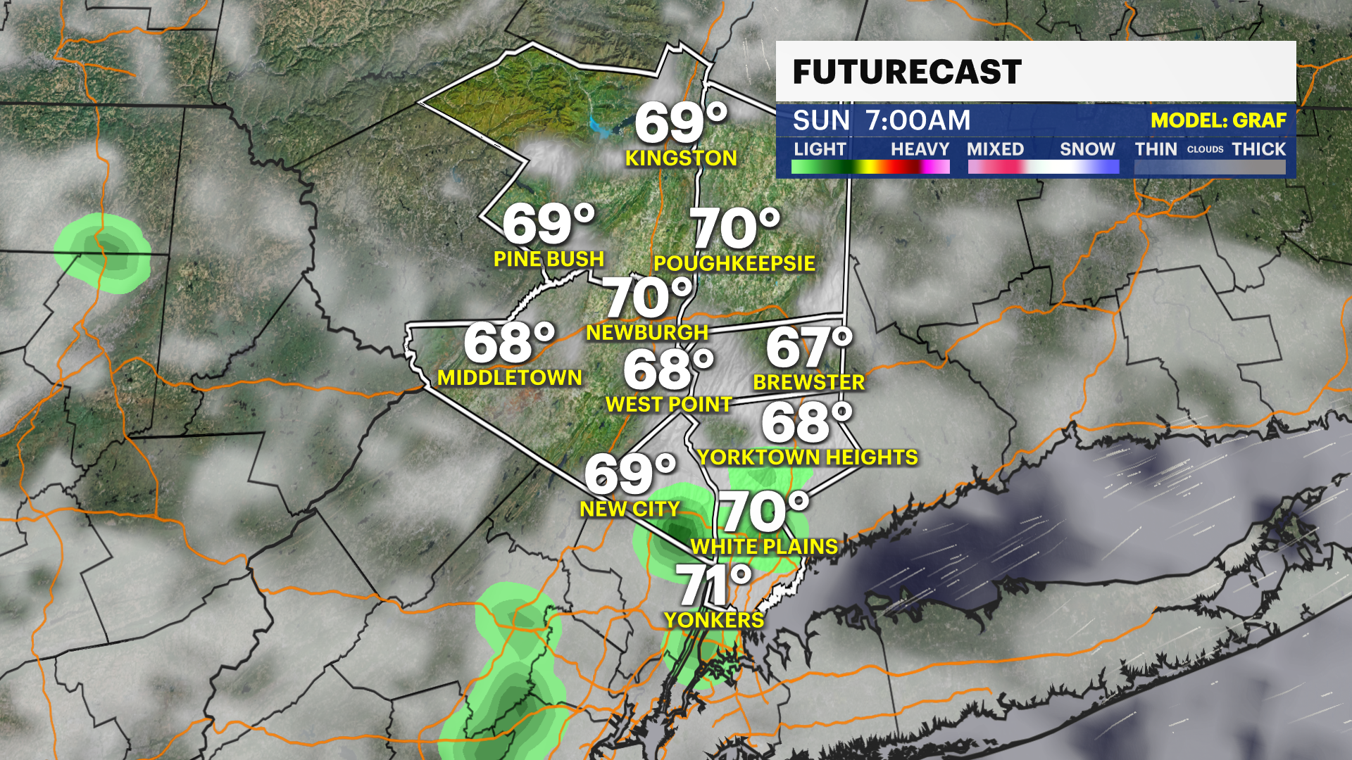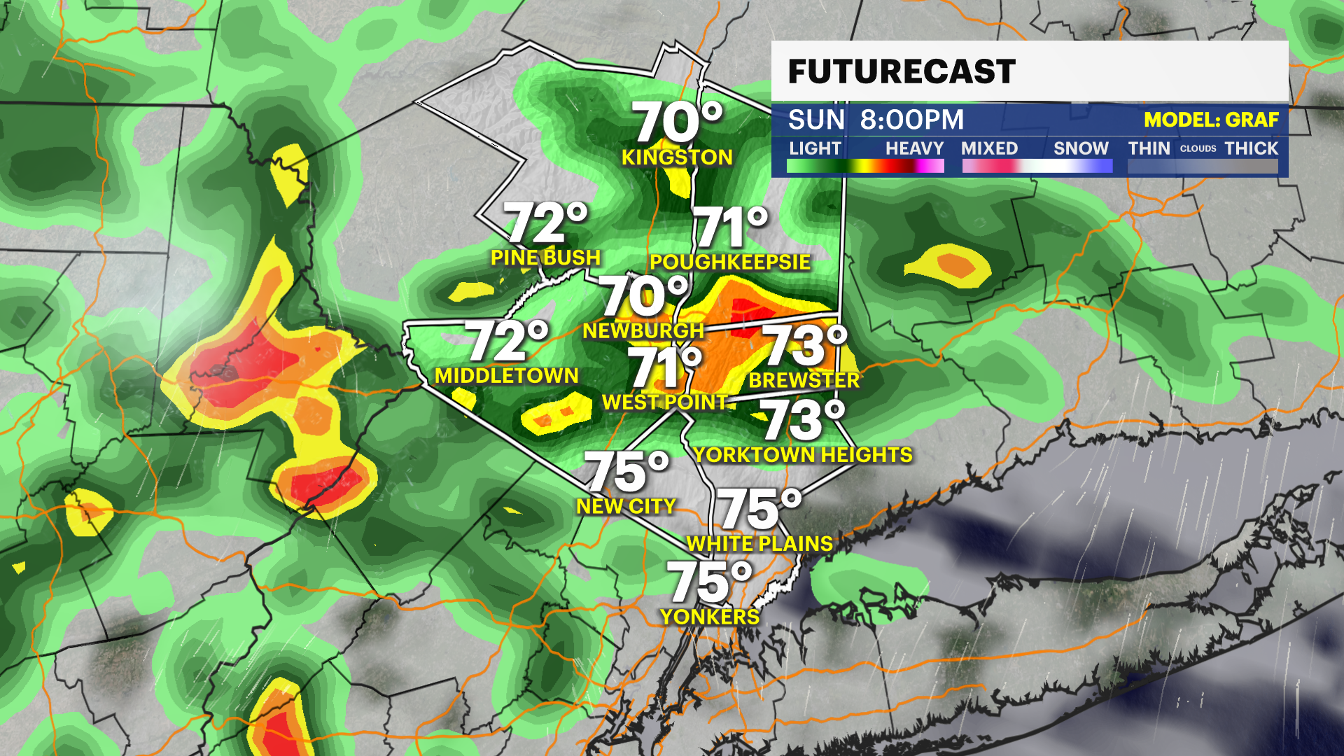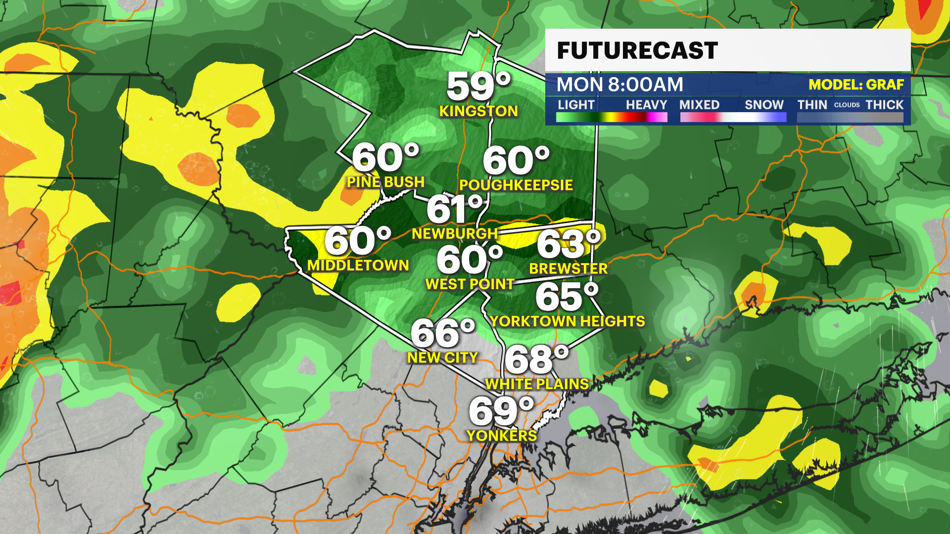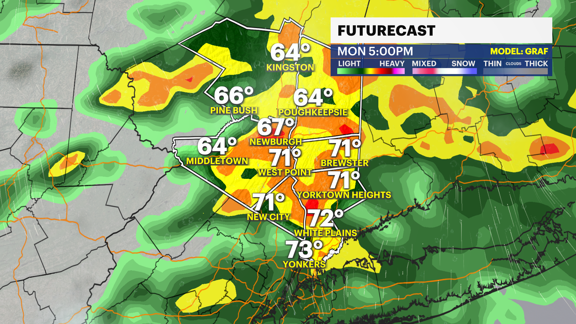 MONDAY - WEATHER TO WATCH: Cloudy with on-and-off rain throughout the day. Humid with highs near 78. Mostly cloudy at night with lingering showers. At least an inch of rain is possible. Lows near 64.