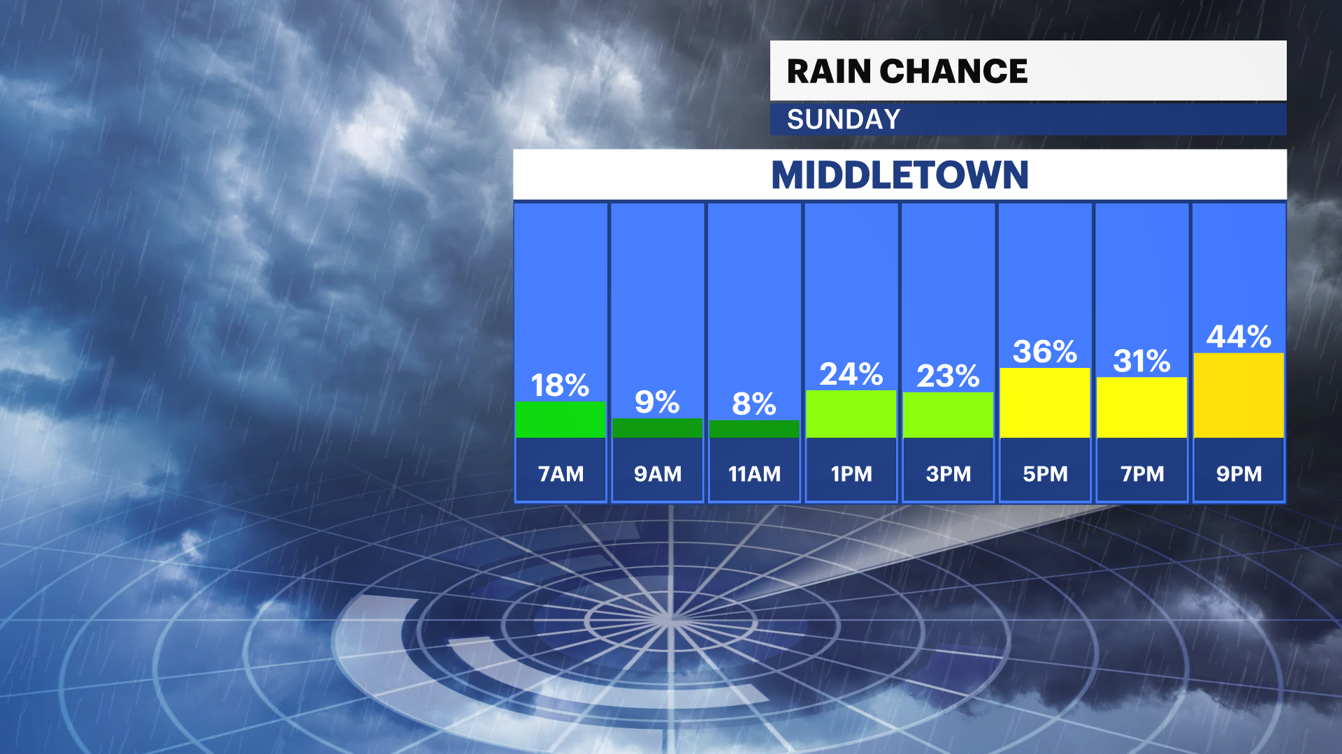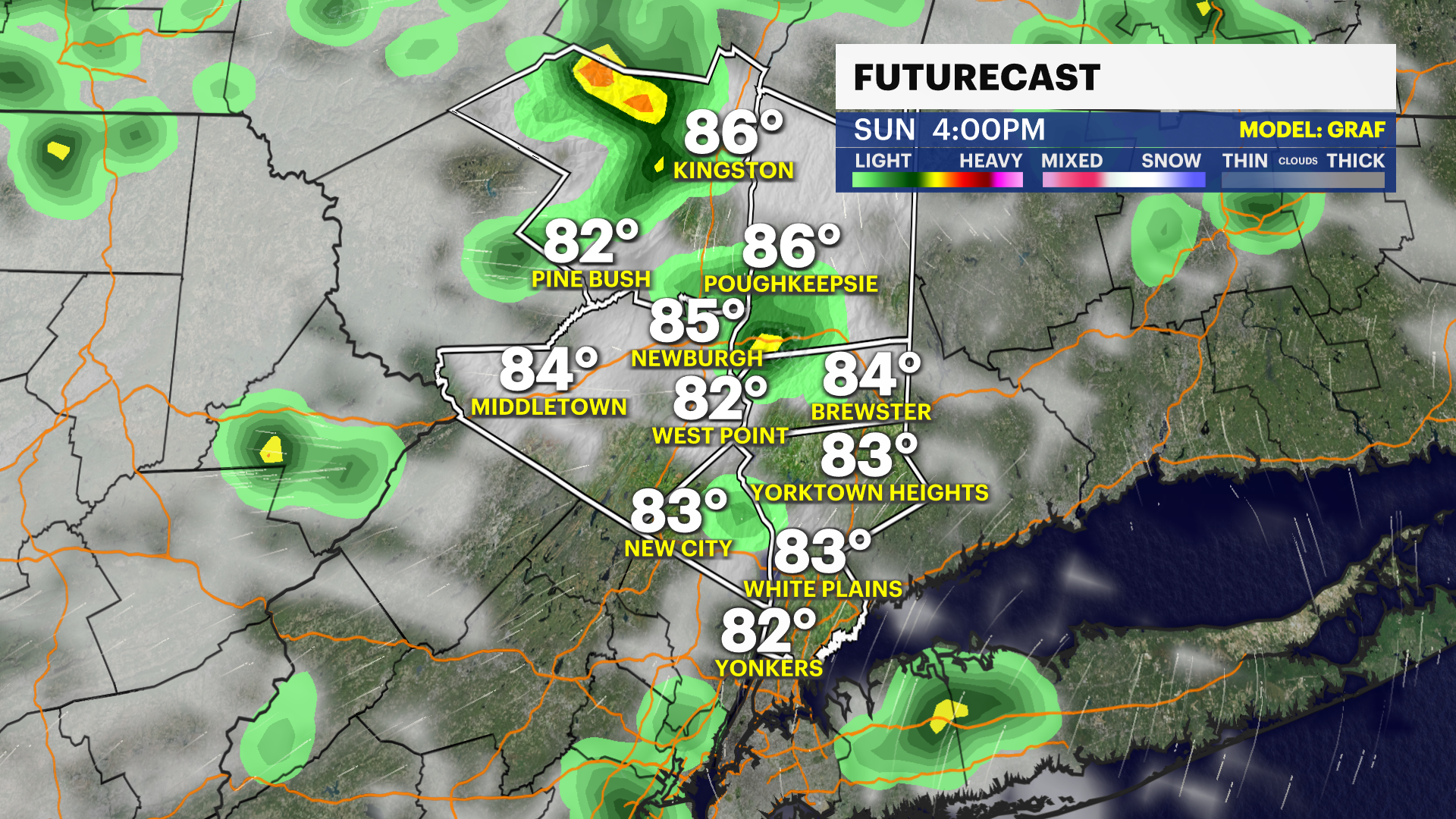 SUNDAY: Peeks of sun with clouds in between. Showers are possible on and off early, then expected in the evening. Highs near 86. Lows near 67.