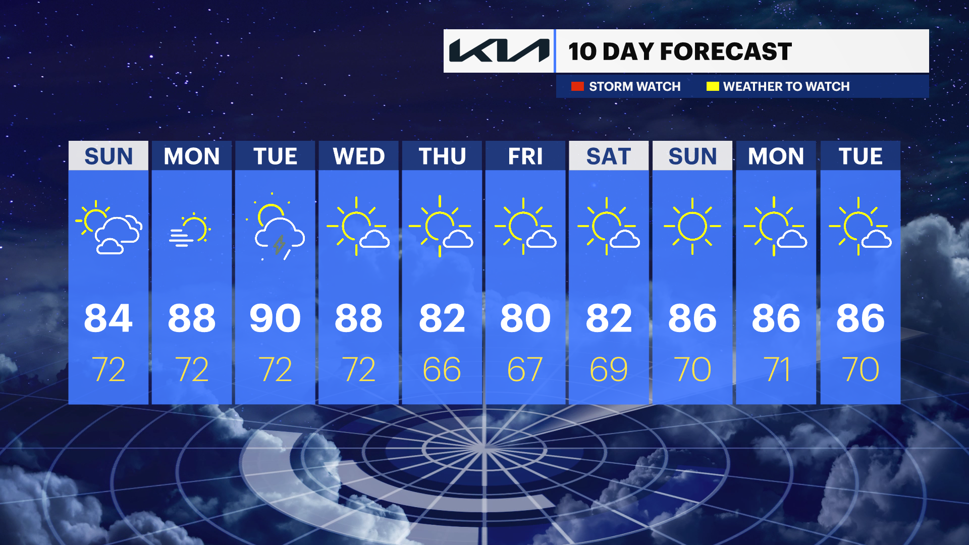 WEDNESDAY: Mostly sunny, still warm. highs near 80, lows near 72.