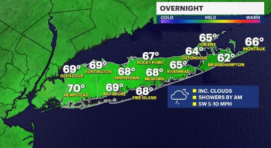 OVERNIGHT: Increasing clouds with at a breeze at times, with showers by daybreak. Lows: low to mid 60s.