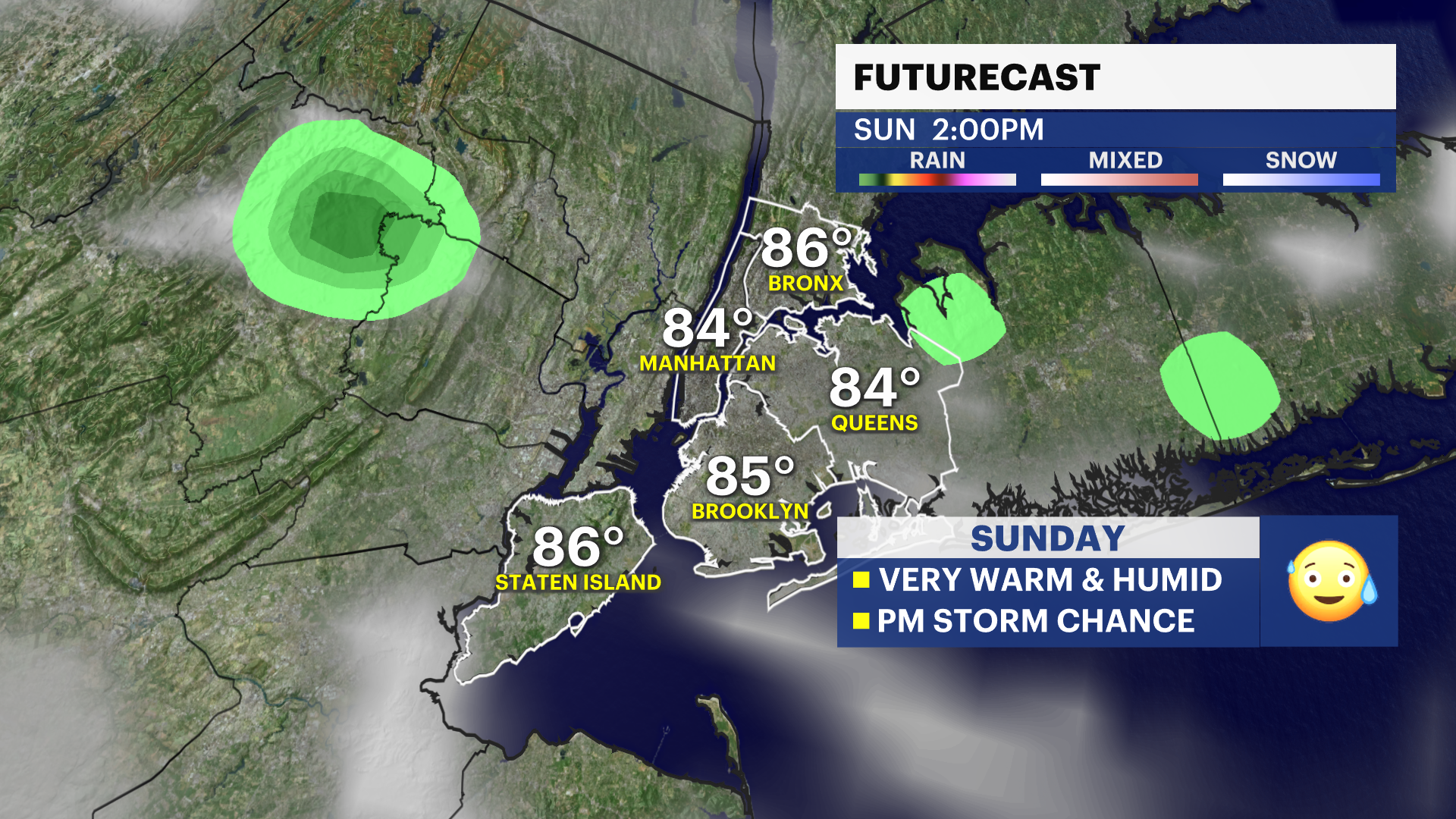 SUNDAY: Partly cloudy and very warm. An isolated morning shower with a shower/storm chances near sunset through midnight. Highs near 85. Lows near 70.