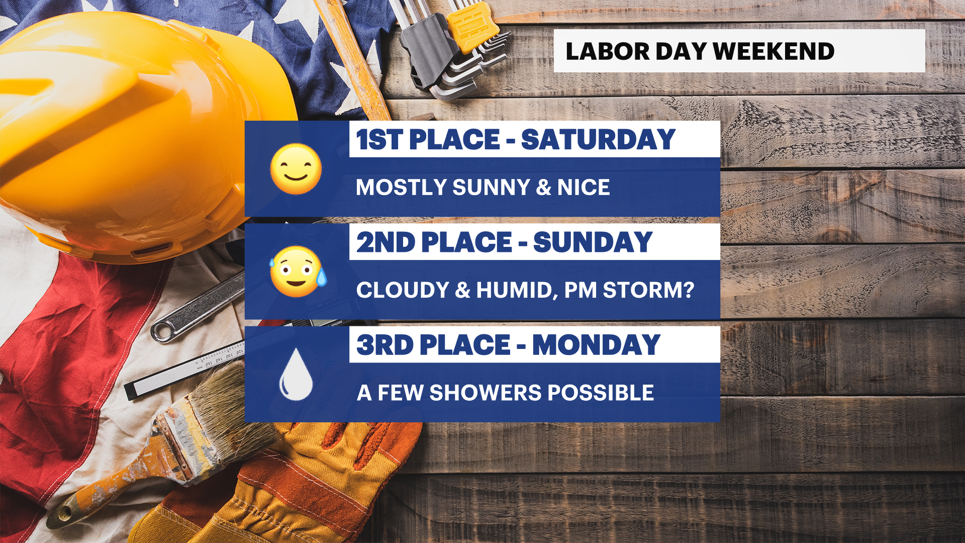 NEXT: 2-for-3 for the Labor Day holiday weekend, late-day shower possible Sunday then a few showers Monday.