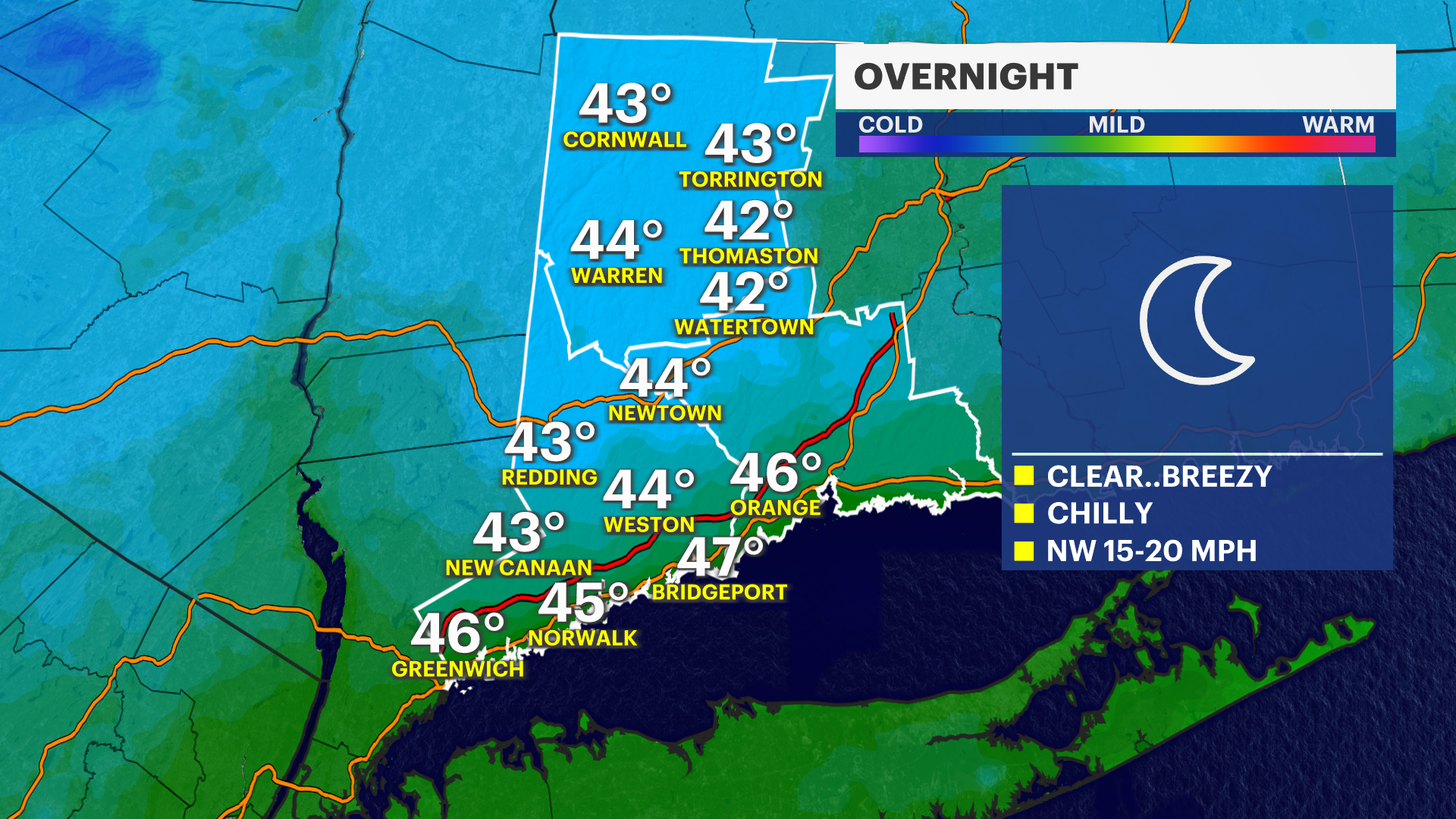 OVERNIGHT: Clear, breezy and chilly. Low of 43.