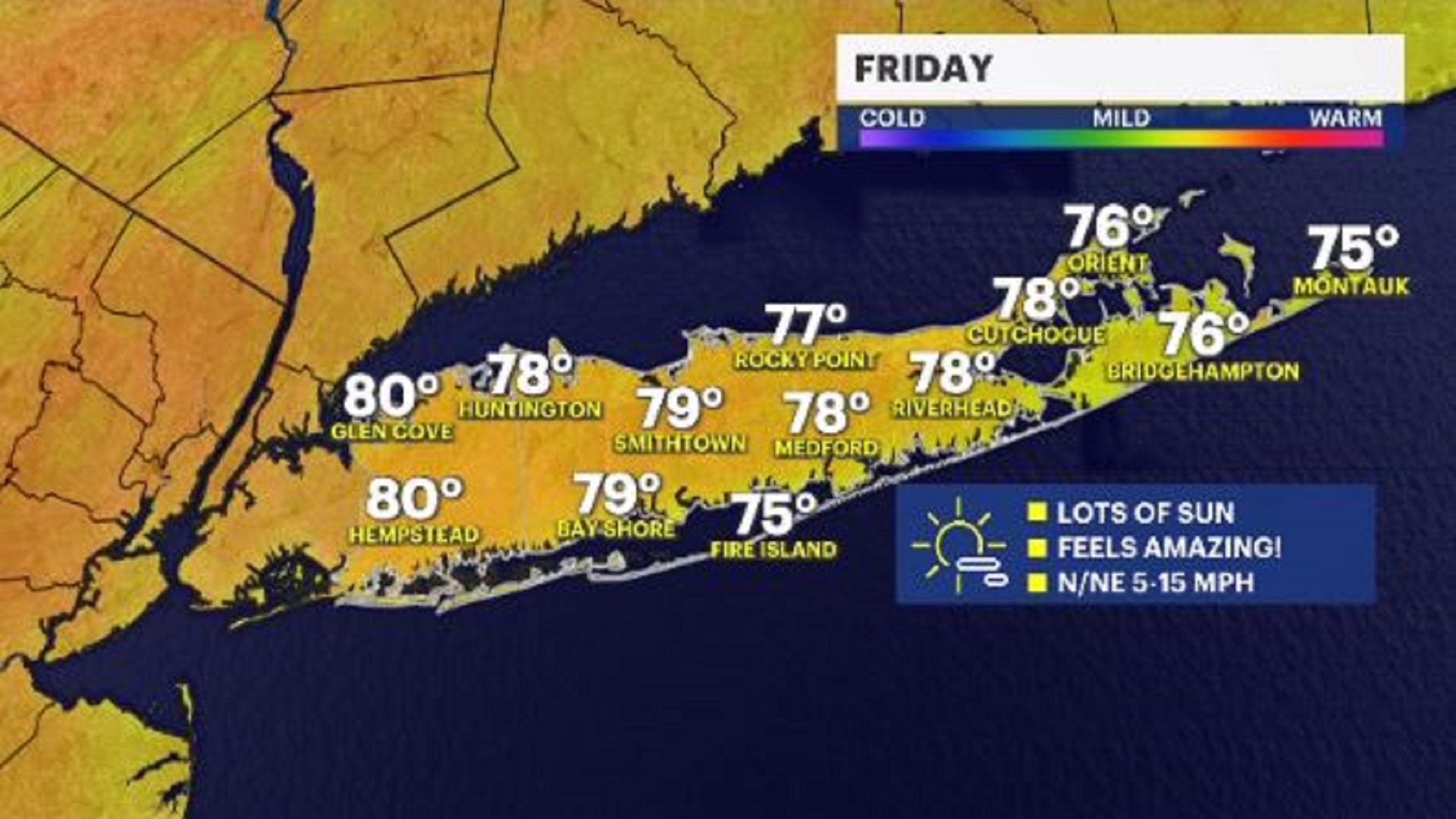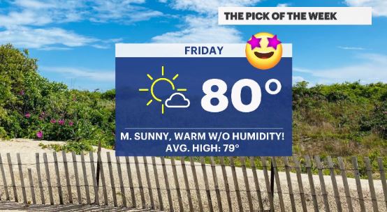 FRIDAY: *Pick of the Week* Sunny & lovely! Warm temps, low levels of humidity and a light breeze. Highs: low 80s. Lows: upper 50s to low 60s.