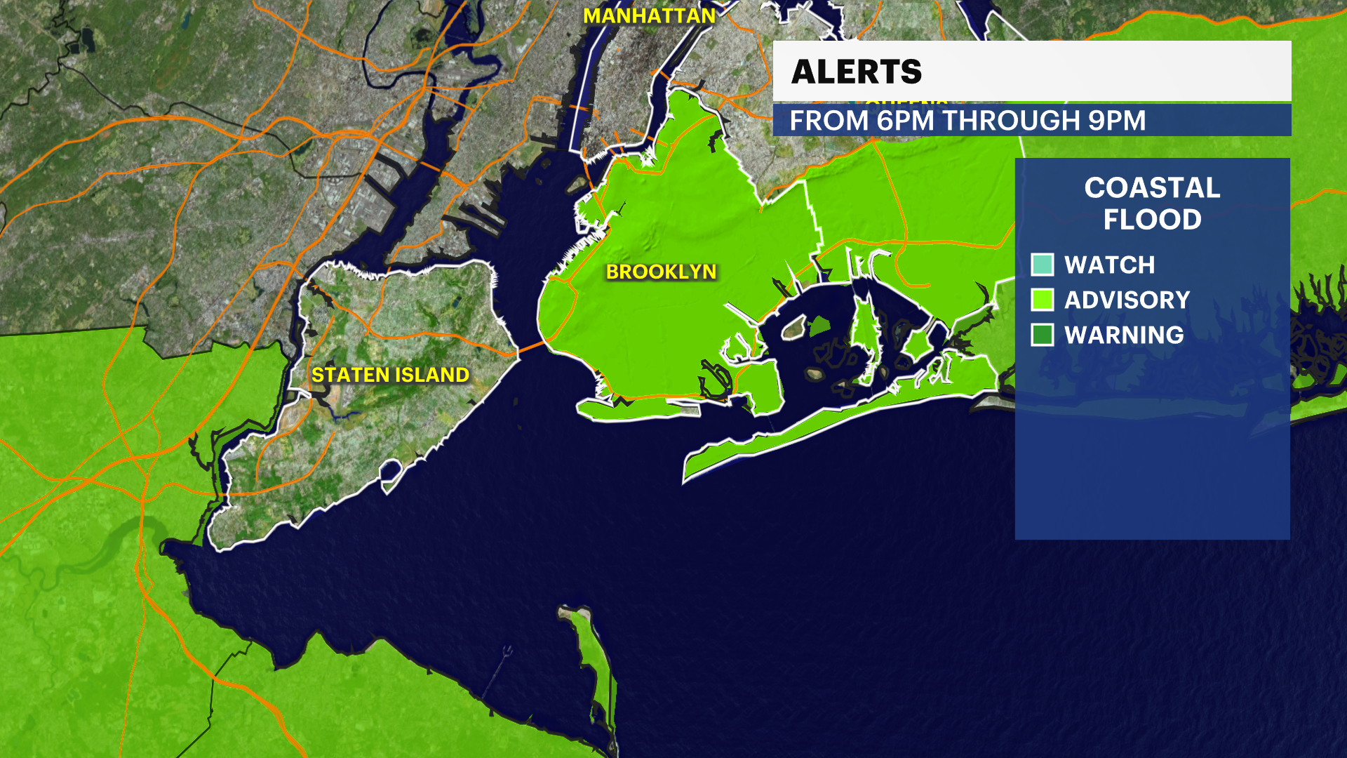 A coastal flood advisory is also in effect for the most prone low-lying areas in Brooklyn and Queens later this evening for the high tide cycle. Minor spillover is expected in these vulnerable waterfront areas due to offshore swells from a nearby offshore storm 6 p.m. - 9 p.m.
