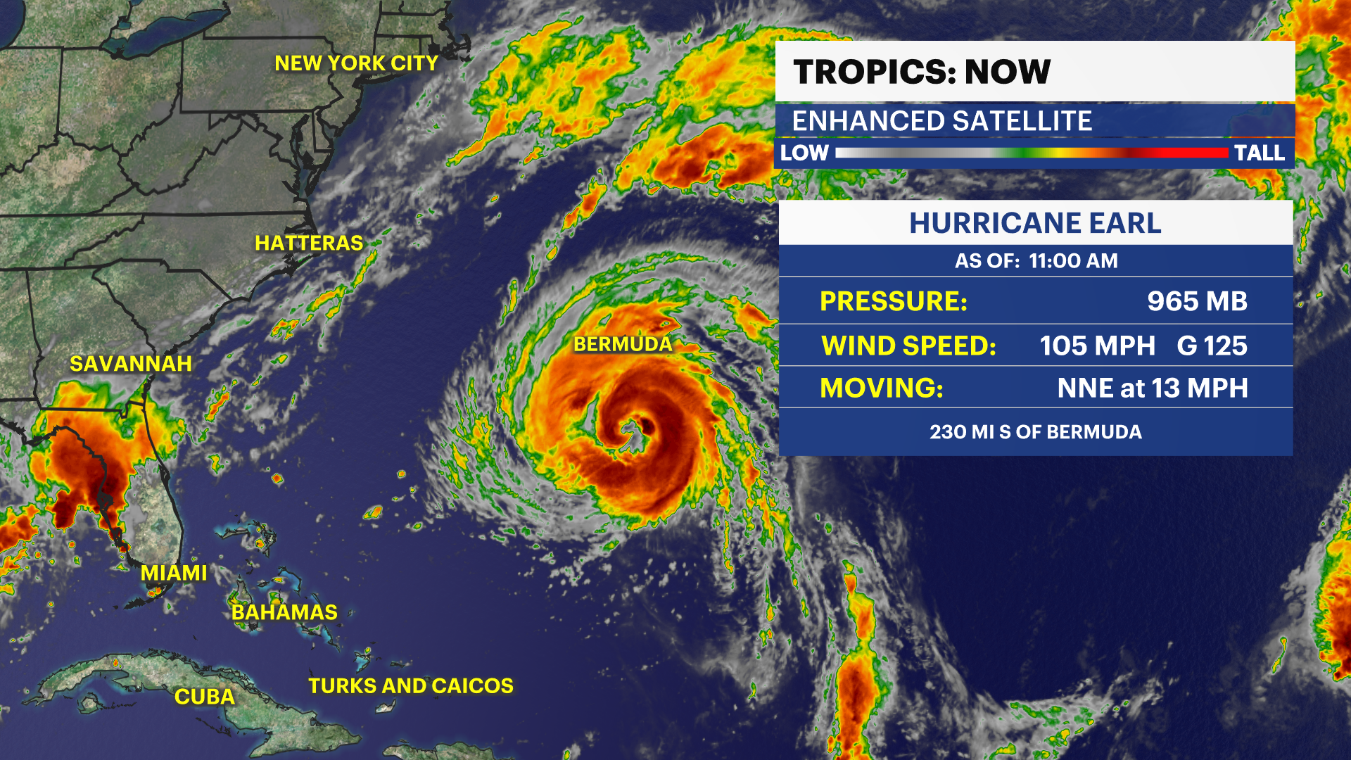 Hurricane Earl is rapidly intensifying as it makes its closest approach to Bermuda. Higher swells and dangerous rip currents for New York City's southern facing beaches.