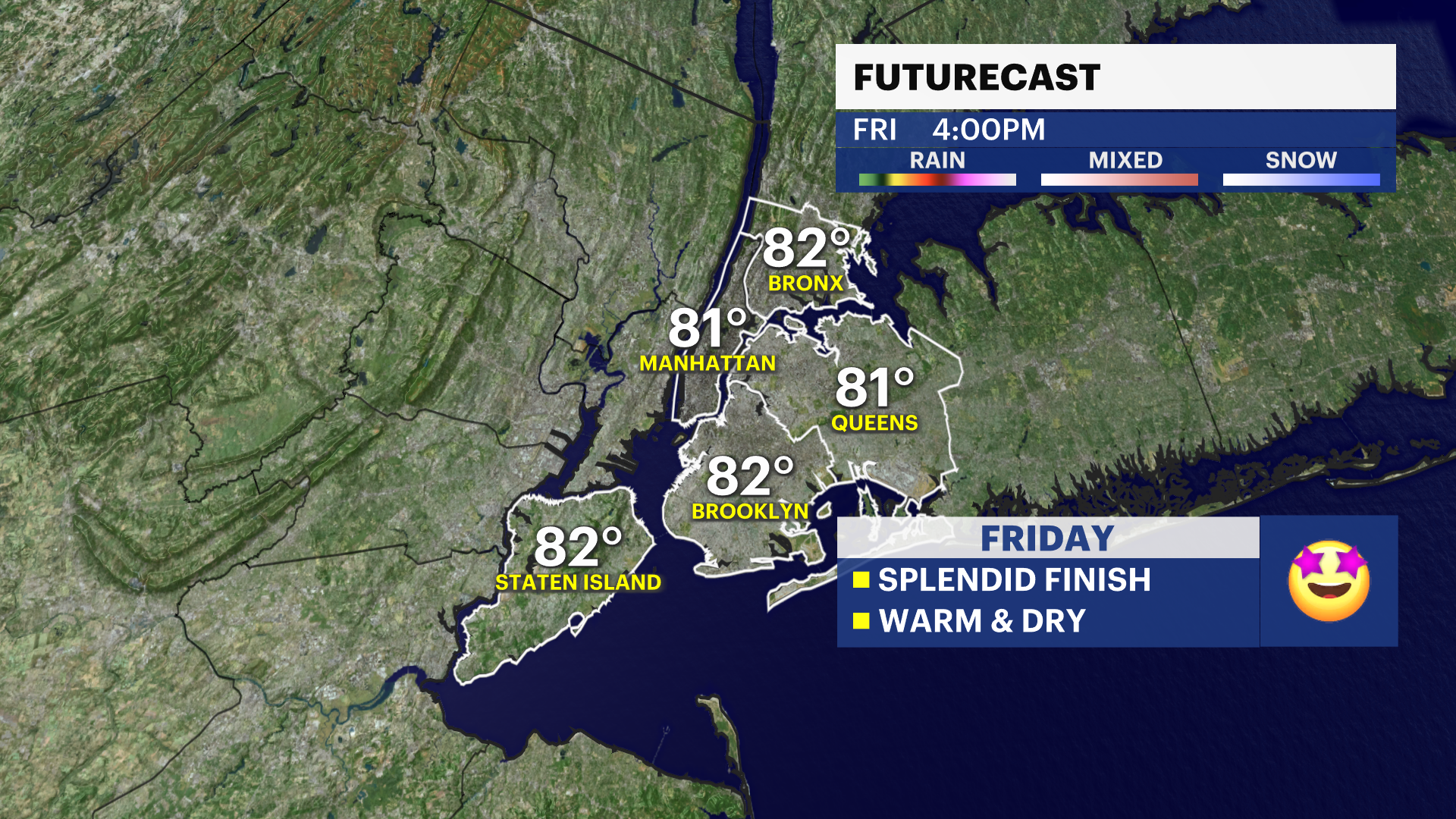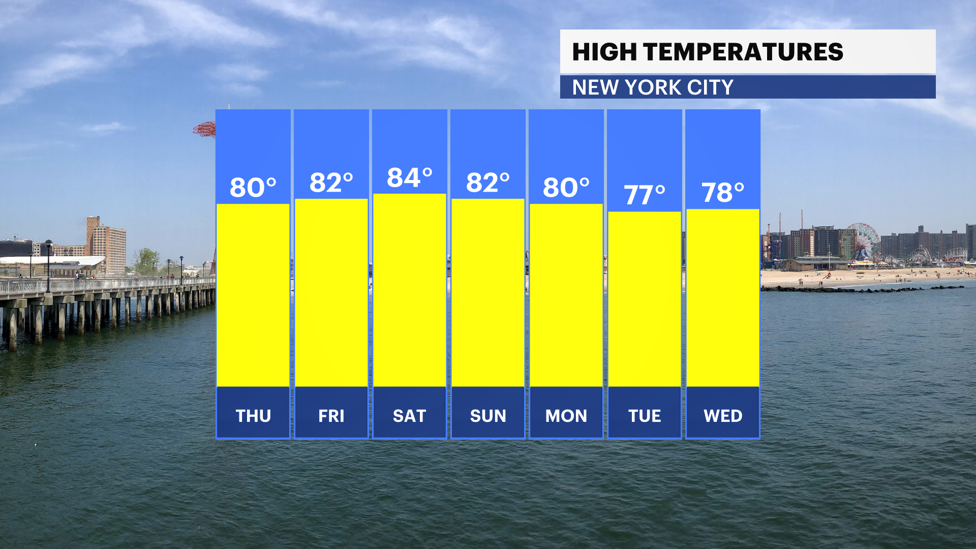 WEDNESDAY: Partly cloudy and seasonably warm. Highs around 81. Lows near 65.