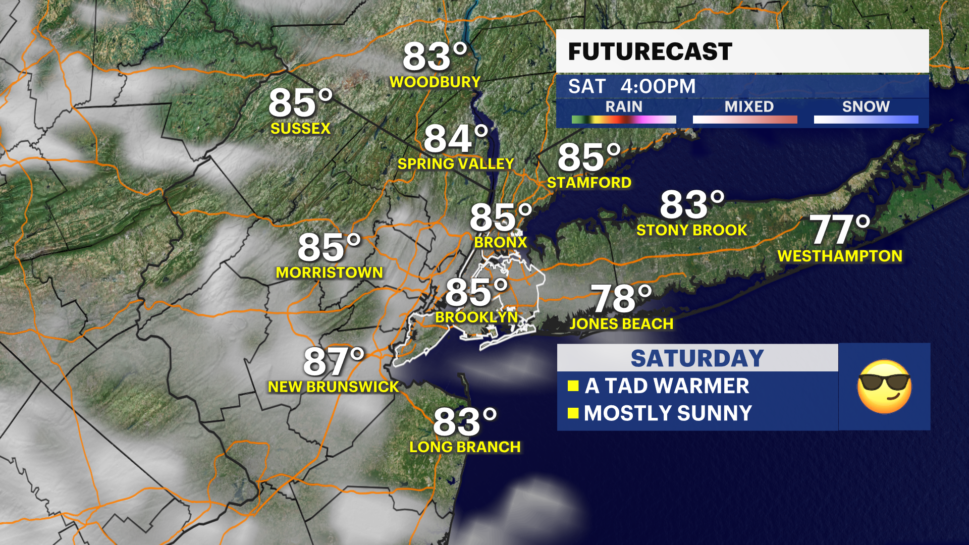 SATURDAY: Plenty of sun and warmer. Highs up to 85. Lows near 66.