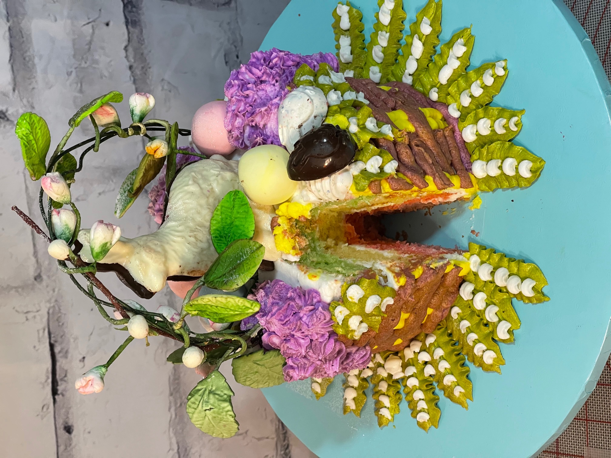 At 4 a.m. in the morning level cakes, fill and stack your cakes. Let chill for 20 minutes then decorate with buttercream...chill again... Right before it is presented place fondant flowers in with chocolate Easter eggs with the bunny in the middle... then place handle in with sugar flowers leaves you made cascading around the wire handle. Sprinkle entire creation with disco dust.