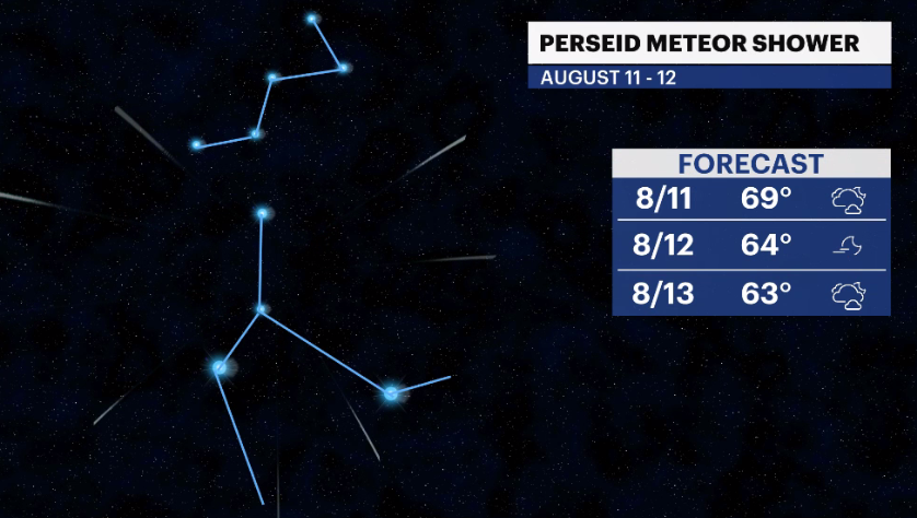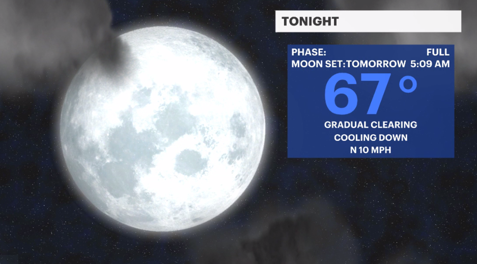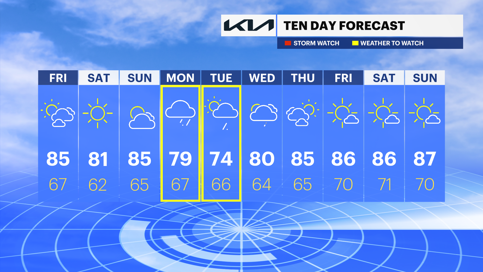 FRIDAY: Starts off cloudy, with mostly sunny skies for the rest of the day. Daytime highs in the mid-80s. Mostly clear overnight with temperatures cooling to around 67 degrees.