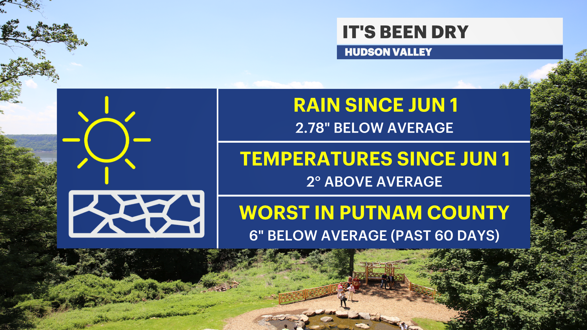 Parts of the county have reported rain deficits of 6 inches. Meanwhile in Westchester County, White Plains has reported average temperatures more than 2 degrees above normal since June 1.