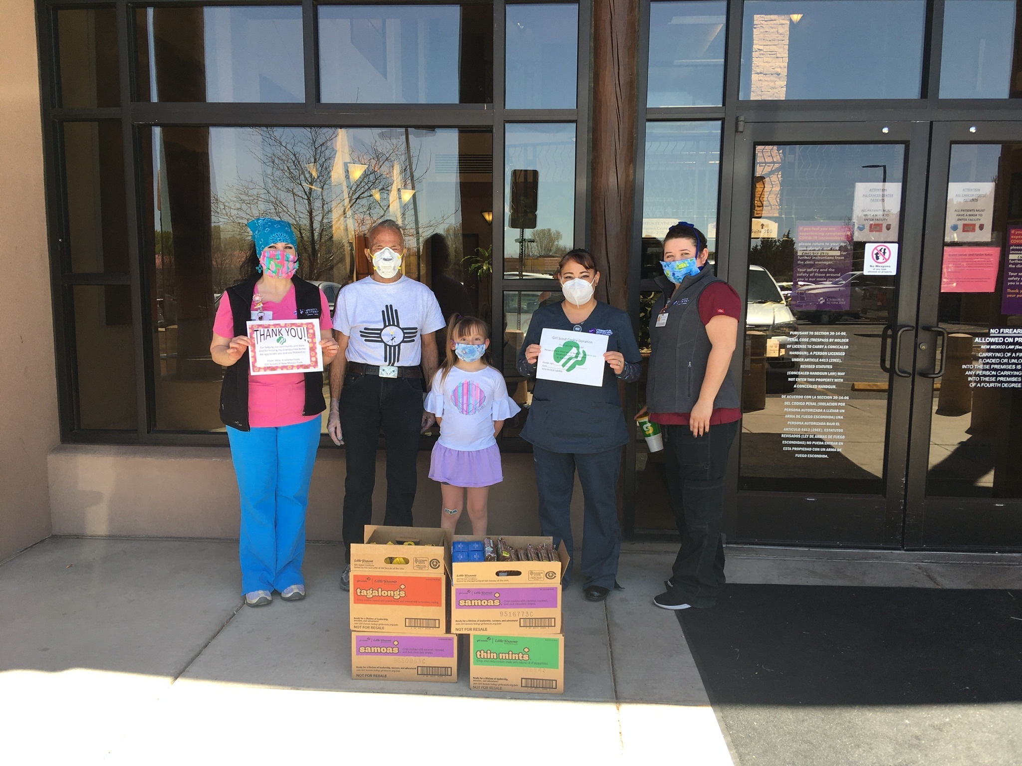 This April 30, 2020 image provided by Girl Scouts of New Mexico Trails shows health care workers with Christus St. Vincent Health System in Santa Fe, New Mexico, accepting a donation of cookies as part of the Hometown Heroes program. (Girl Scouts of New Mexico Trails via AP)