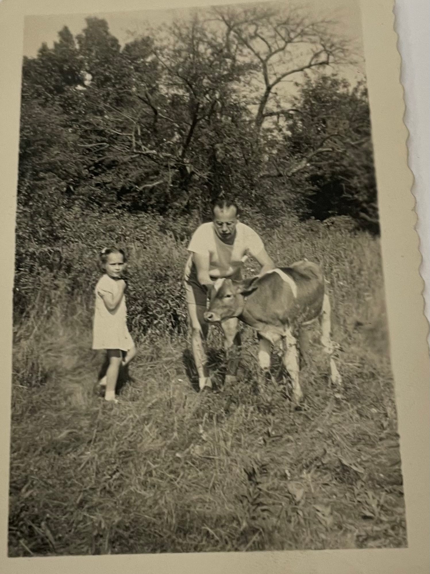 The photos were found inside a volume that was donated to the library book sale. They date back to the 1930s, and include portraits, a few baby pictures and one of a calf.