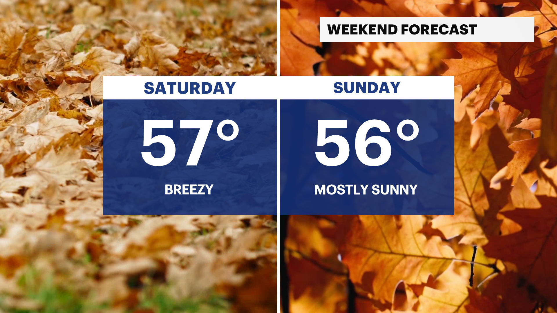 Sunshine returns Saturday with highs in the mid- to upper 50s. Winds finally settle down by Sunday, and temperatures climb near 60 degrees.