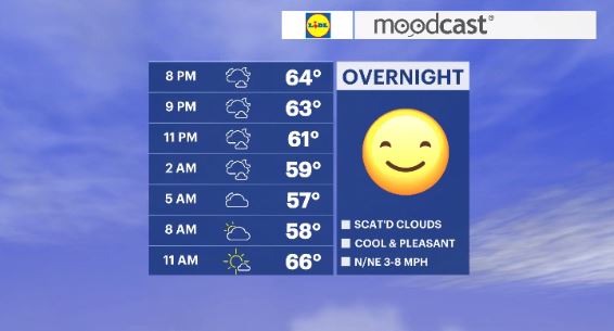 OVERNIGHT: Partly cloudy skies, mild to cool temps, Lows: upper 50s to mid 60s.