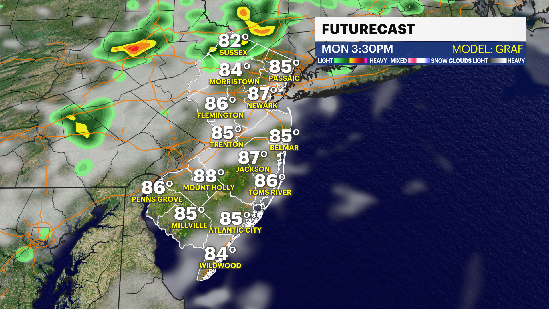 Monday: Sunny start, showers and storms 5 p.m. onward. Some stronger. Highs upper-80s.