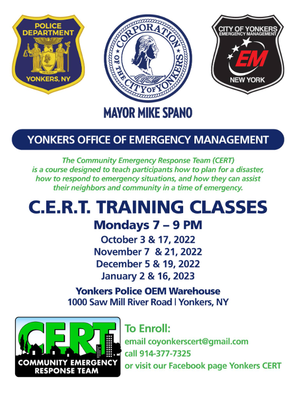 The class will take place at the Yonkers police OEM Warehouse on Mondays from 7-9 p.m. and will run until January.